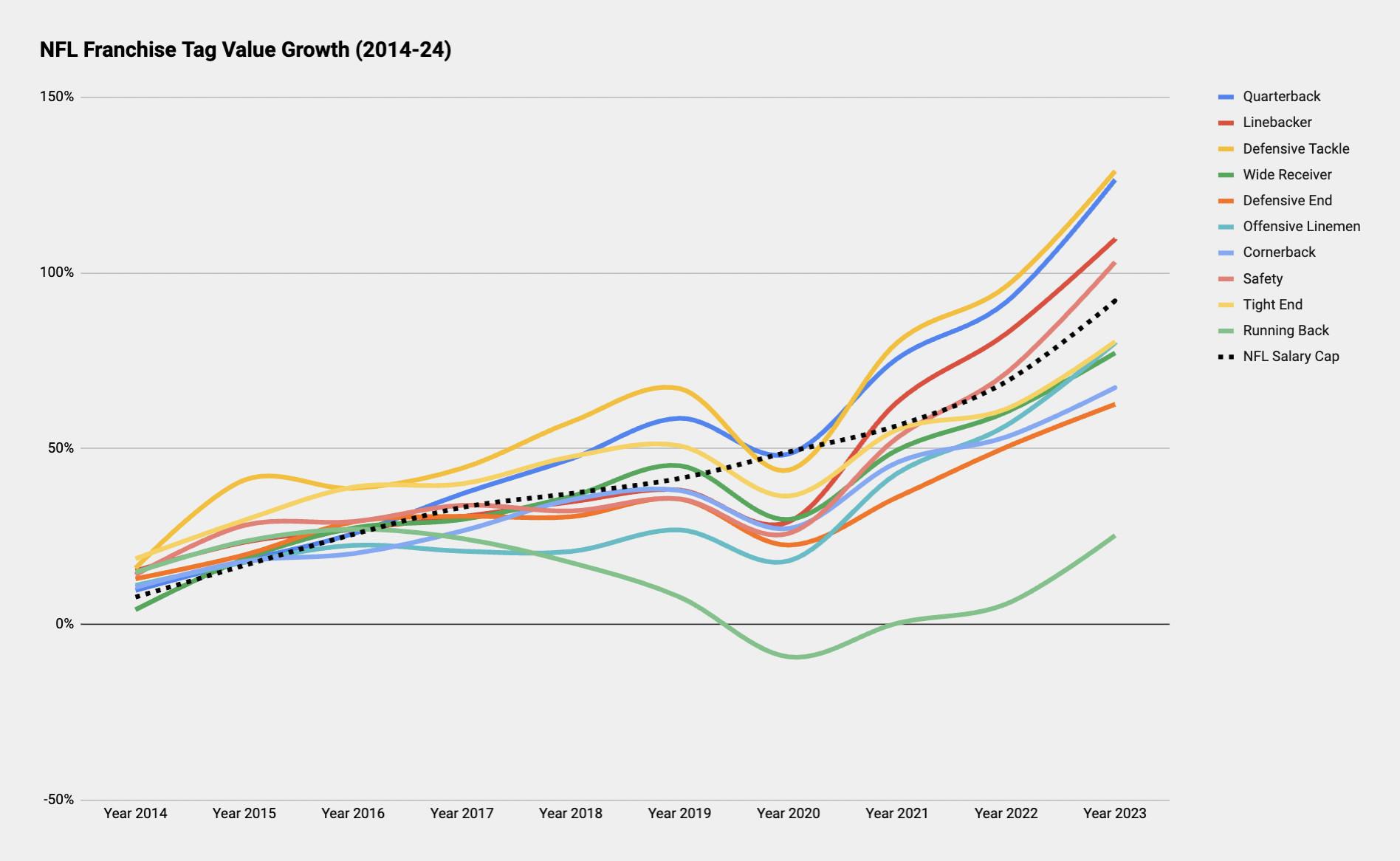 The NFL salary cap has increased by 92 percent over the past decade (2014 to 2024). The franchise tag number for running backs, which is an average of the top five highest-paid players at the position, has increased by just 25 percent in that span. Every other major offensive or defensive position has seen its franchise number increase by 60 percent or more.