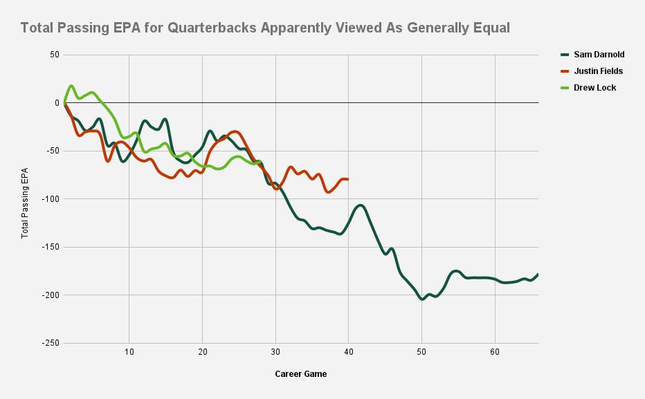 If we look at total passing expected points added, we see that Fields is better now than Darnold was at the same point in his career, as well as at this exact moment in time. Lock, who has far less experience, is about where Fields was at that time in his career—but remember, he’s already had two cracks at a starting job, and he may get a third this summer in a Giants camp competition with Daniel Jones.