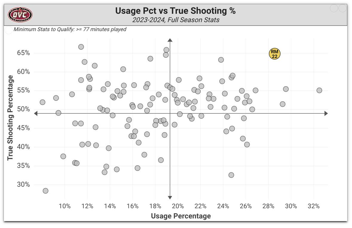 Minix the Menace is a fascinating case of talent that really translated. He’s a fifth-year grad student who spent his first four college seasons at Southeastern University in Florida, at the NAIA level, and his game interfaced with Division I better than anyone could’ve hoped. The OVC Player of the Year was the most efficient high-usage player in the conference by a wide margin, with a shot repertoire that comes at you from a variety of angles.