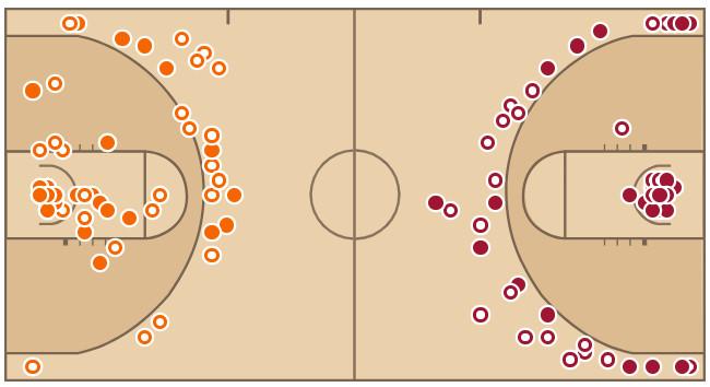 When Oats’s players aren’t chucking it from deep, they’re usually attacking the rim. The former high school math teacher has unsurprisingly embraced the analytics movement in basketball, which leans away from the midrange game in favor of 3s and shots near the basket. This shot chart from the Clemson game would bring a tear to Daryl Morey’s eye.
