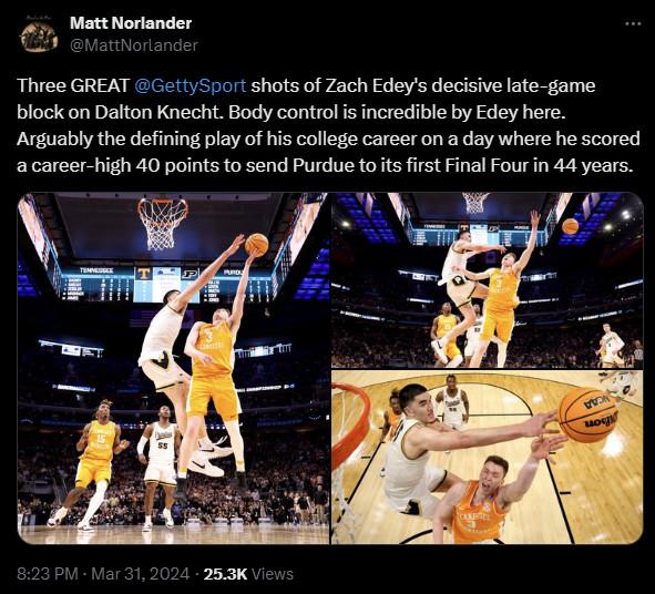 Slow-footed big men have been phased out of the league in recent years because of their limitations on defense, and maybe that’ll end up being a fatal flaw for Edey. But he’s improved his mobility a lot at Purdue, and he’s an imposing rim protector. Just look at what he did late in the game against Tennessee on Sunday, coming up with a clutch block against potential lottery pick Dalton Knecht. Photos capture the skill involved with this block more than video: