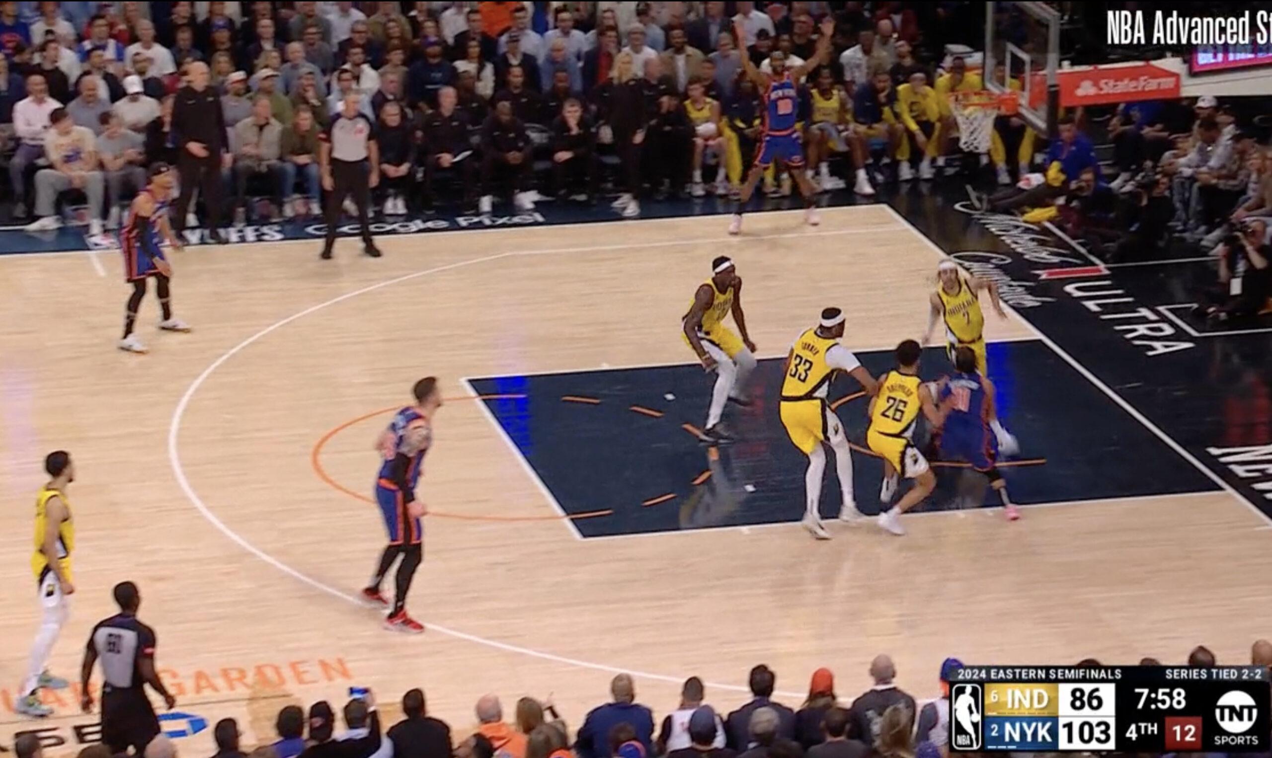 For a picture of pure determination, look no further than a freeze-frame of New York Knicks guard Jalen Brunson bounding into the lane, with Ben Sheppard on his left hip, Myles Turner and Pascal Siakam converging, and Andrew Nembhard charging straight at him—a virtual blanket of yellow jerseys and several yards of wingspan obstructing every conceivable path between Brunson’s hands and the hoop high above him.