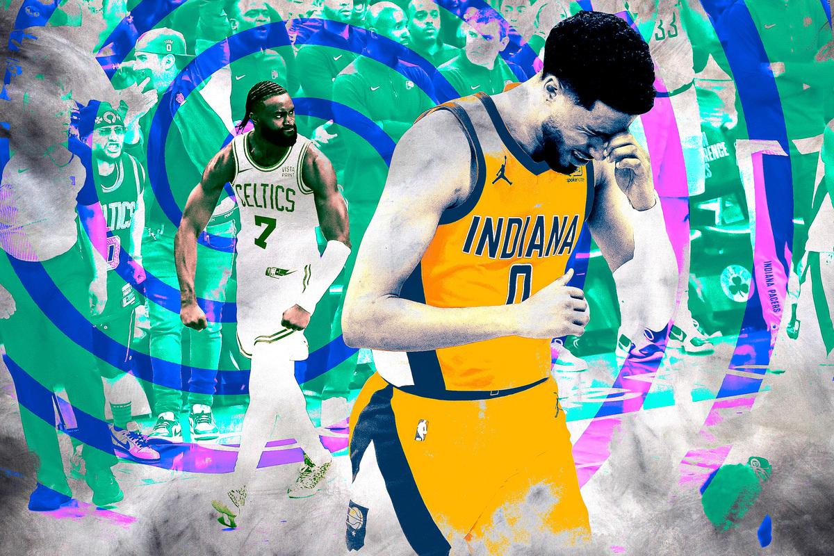 In a brilliantly tense Eastern Conference finals opener punctuated by mind-numbing human error from practically every angle, perhaps it’s best to dwell on a moment of objective beauty, for the sake of everyone’s sanity: Jaylen Brown’s game-tying 3-pointer with 5.7 seconds remaining in regulation. A real stunner. To pump-fake from the bleeding edge of the left corner with Indiana Pacers star Pascal Siakam crowding his airspace, to swivel and gather the ball on his right side with Siakam shading his left, to rise from a standstill and readjust his contorted frame in midair, falling away from Siakam, whose mere presence ought to have been enough to sap the remaining probability from such a difficult attempt. It was, in a sense, a pure and timeless play, a mastery of the moment that rises above the chaos that emerged before and after.