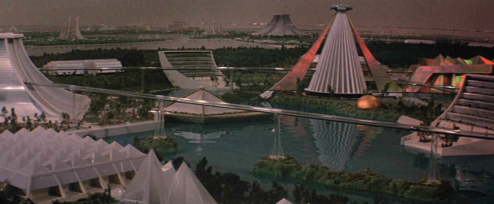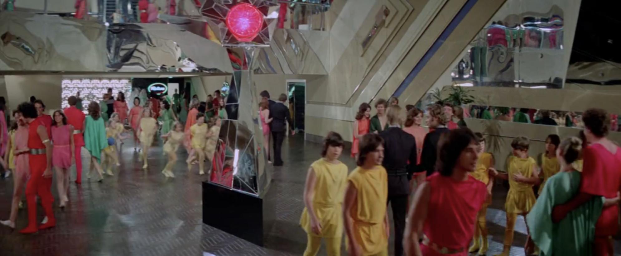 Think Midsommar Coachella. It’s set in a future world in which the only survivors (festival attendees) are the people who have outlived the gross negative effects of overpopulation and pollution to party inside a sealed-off dome with colorful tents and outfits. It’s a completely ecologically balanced world where “mankind lives only for pleasure” because all of the painful necessities of life are provided by a combination of the government, brainwashed pseudo-policemen, and robots.