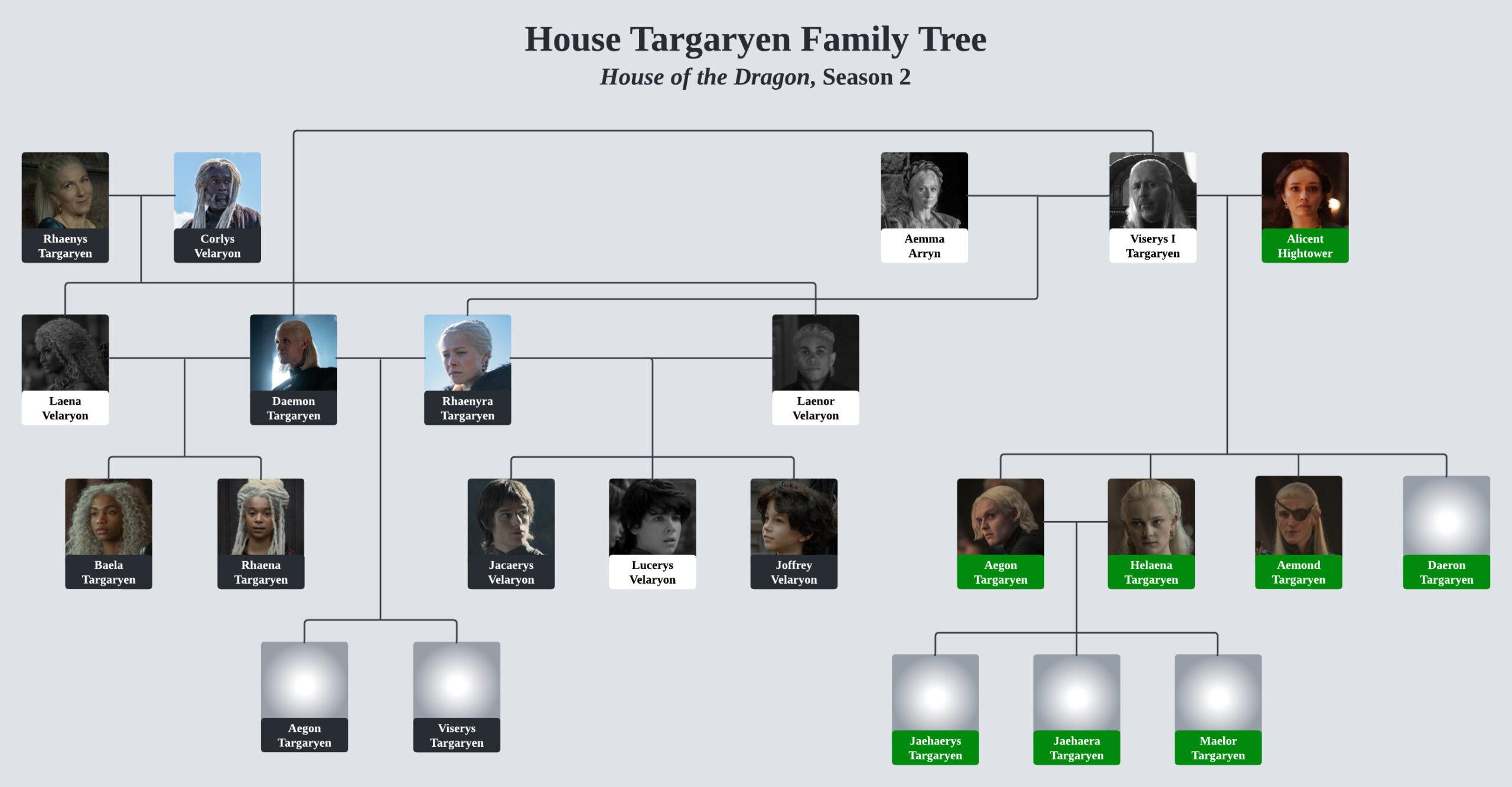 Daeron Targaryen: The youngest child of Viserys and Alicent. Aged 15, he has not been seen on-screen because he is in Oldtown, serving as cupbearer to Ormund Hightower, his mother’s cousin. Daeron rides Tessarion, who is said to be of fighting size.