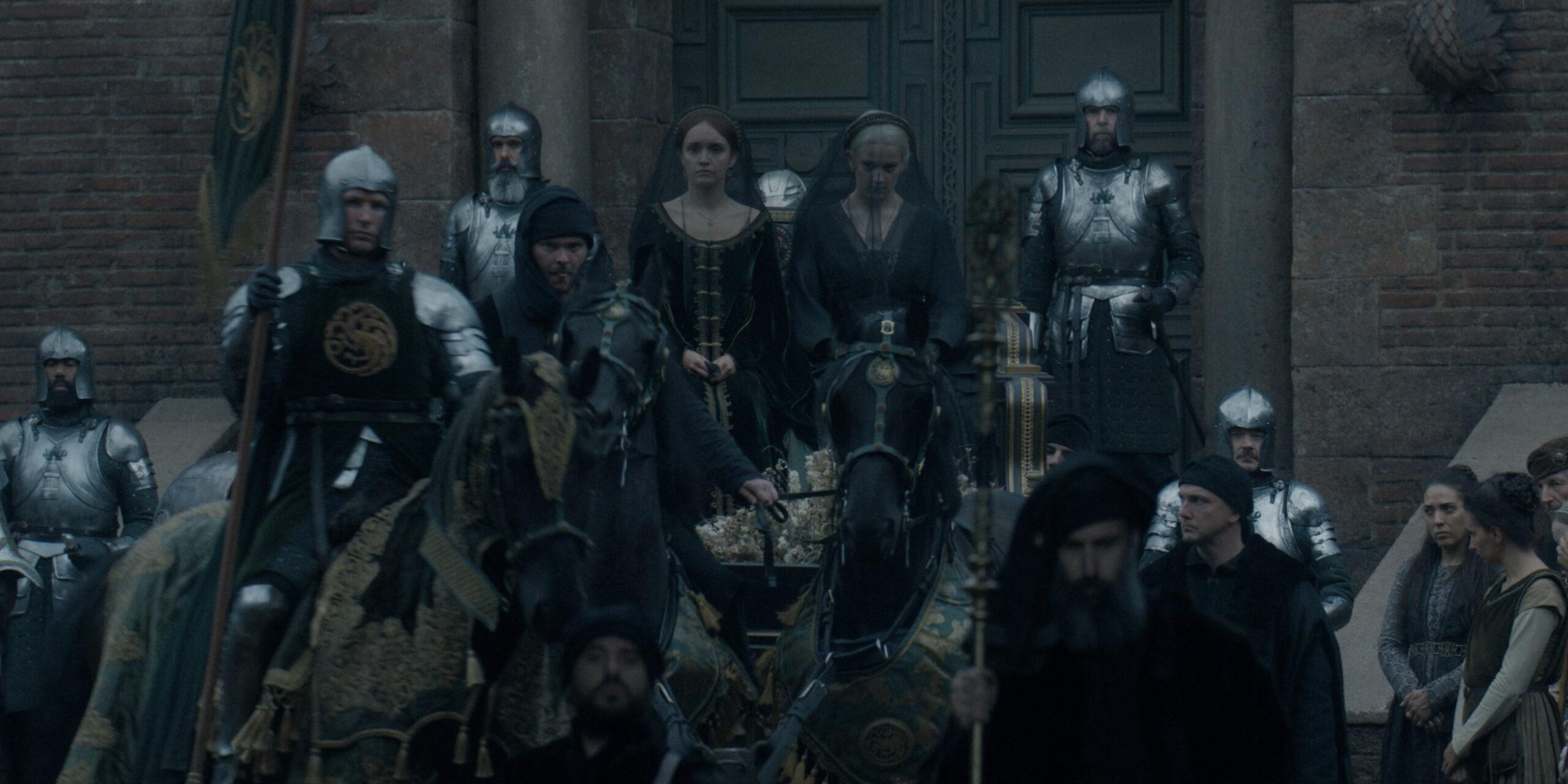 Alicent and Helaena wear different clothing in that trailer shot than they do in Jaehaerys’s funeral procession. The green of their dresses looks lighter, for one. And Alicent’s dress has a different pattern in Episode 2, with a yellow design diving all the way down her front …
