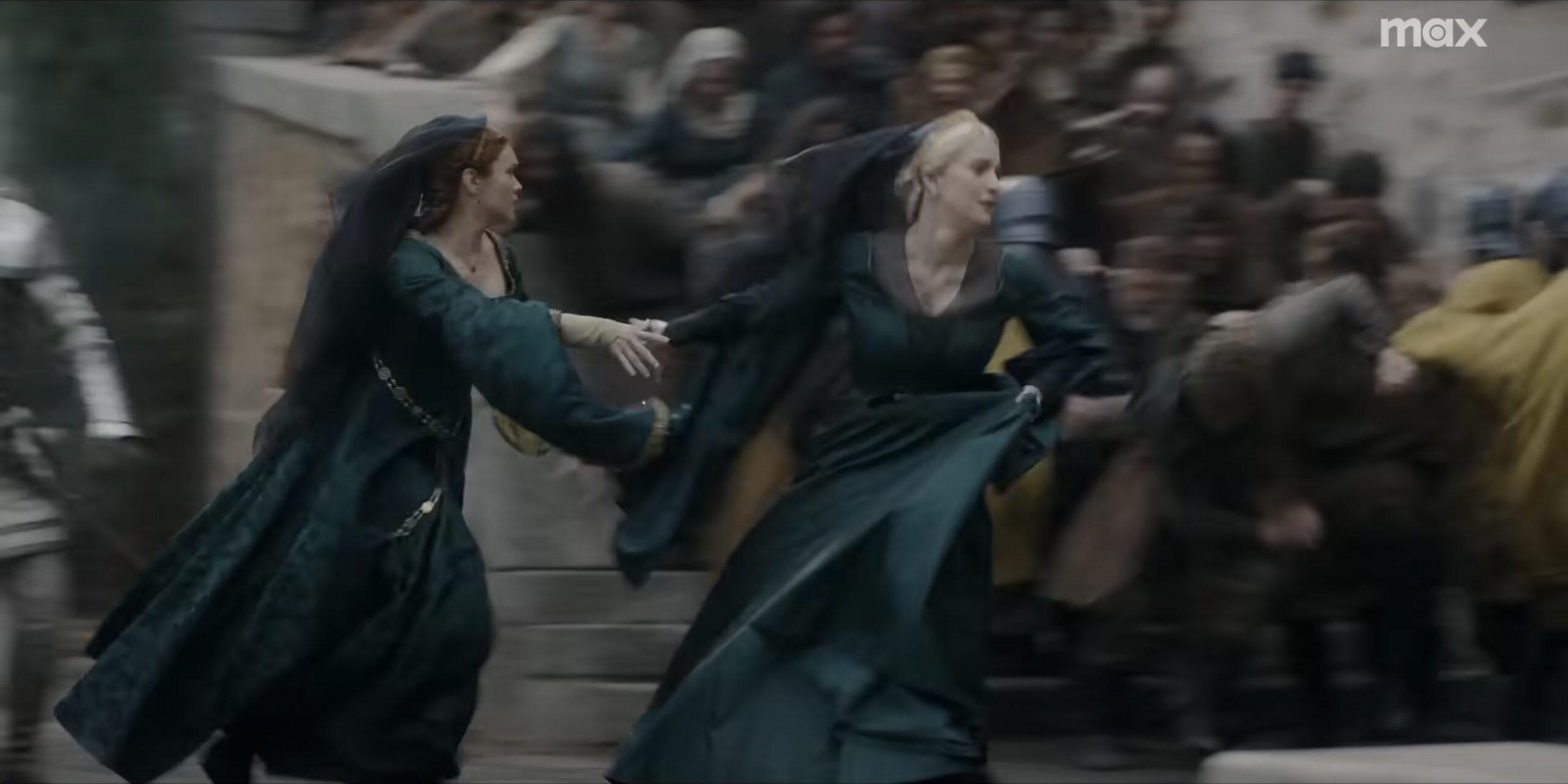 Trailers frequently lie. But you’re right that several Season 2 preview materials showed Alicent and Helaena running in King’s Landing, so we should place some more stock in the idea that this image will appear on our screens at some point over the next six weeks: