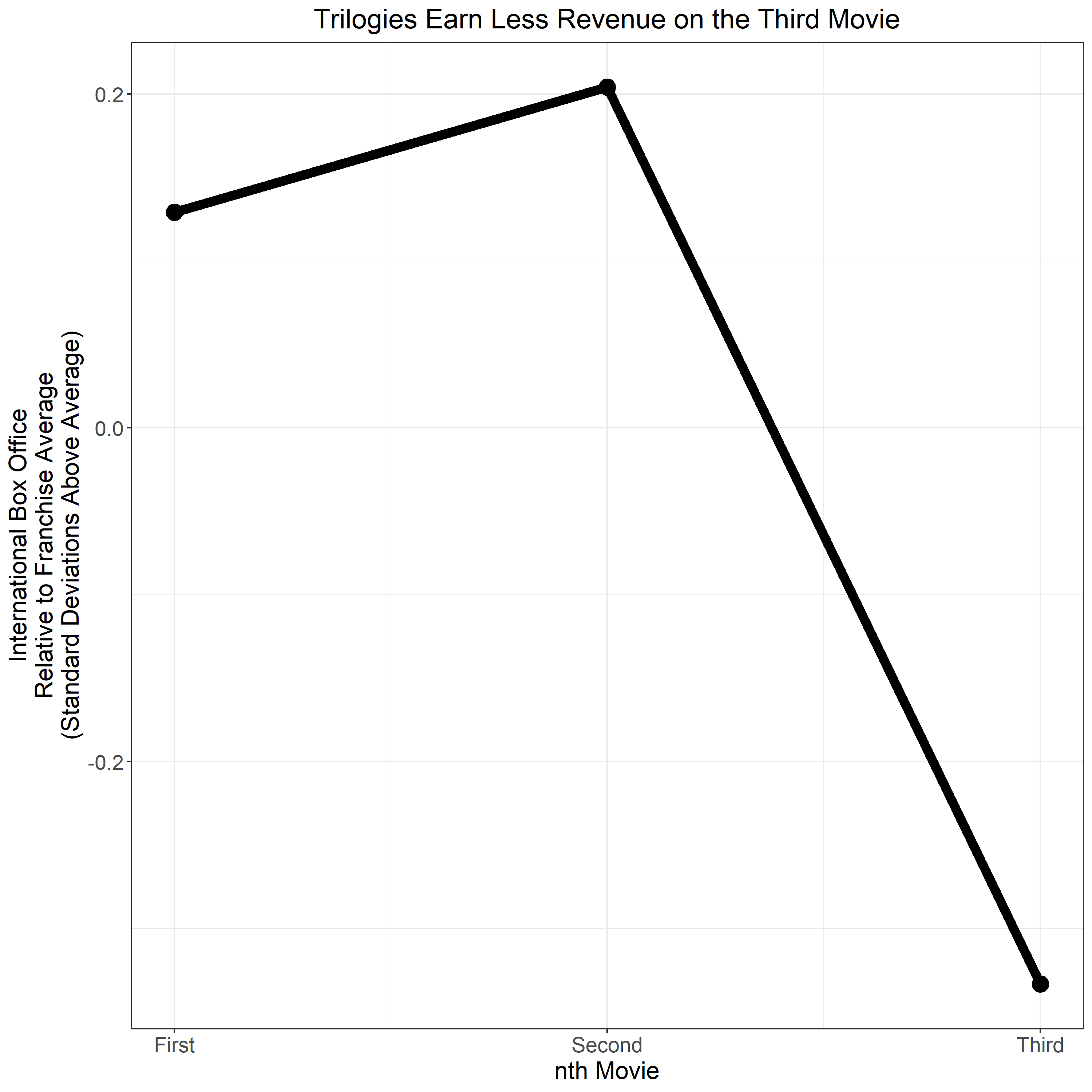 Admittedly, none of that means that the latter installments in veteran film franchises tend to be bad box office earners; it just means that they tend to be less lucrative than the earlier installments. (Indeed, if we compare even later franchise films’ performance to the box office baseline, instead of the standard for that franchise only, the franchise films do better—though they also typically cost more to make.) The Force Awakens made much more than The Last Jedi, which in turn made more than The Rise of Skywalker, but this is still Star Wars we’re talking about; even the last entry in that trilogy of trilogies made more than $1 billion worldwide.