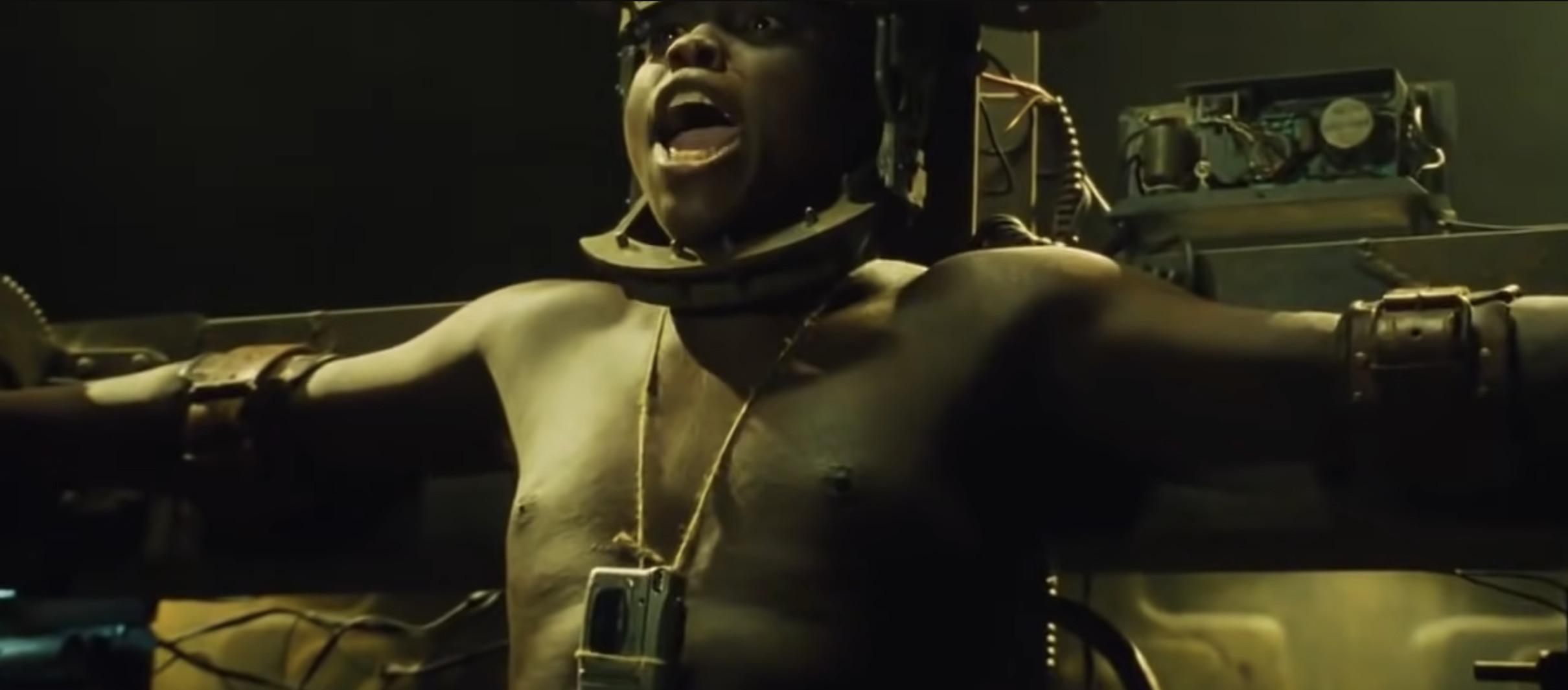 By the time Hannibal Lecter makes his escape in The Silence of the Lambs, we’ve already seen multiple cadavers and body parts, including a pickled head in a jar. But all of these corpses appear under clinical circumstances—all the blood had dried, as it were. We’re also led to believe that Lecter is violent but contained—his potential danger spoken of but put to rest. Until the reveal of Lecter’s macabre tableau, the extent of his capabilities has only been teased. Here, not only does he string up one of the guards assigned to him, entrails dangling from his abdomen, but he borrows the face of the other, fakes a seizure, and is wheeled out by the medical team called to save the victim he is now wearing as a disguise. It’s the perfect crescendo in the film’s orchestration of Lecter’s intellect, clinical precision, detachment, control, and gruesome monstrosity. —Knisley