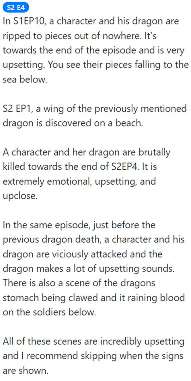 In 2020, behavioral scientist Clive Wynn told me, “If you’re watching fiction, then you take the death of people for granted, whereas the death of an animal somehow breaks through that fictional lightness.” This effect apparently applies even to fictional animals that lack real-life equivalents. I talked to Wynn for a story about humans’ attachment to fictional dogs, as evidenced by “Does the Dog Die?”, the crowdsourced site whose users warn others about dog deaths in media. The mandate of “Does the Dog Die?” has expanded over time: It now provides many other kinds of content warnings. In the “animals” category, only four species’ deaths are specifically flagged: dogs, cats, horses … and dragons. Site creator John Whipple says the “a dragon dies” warning was added in 2018, late in Thrones’s run. It’s come in handy during HotD.