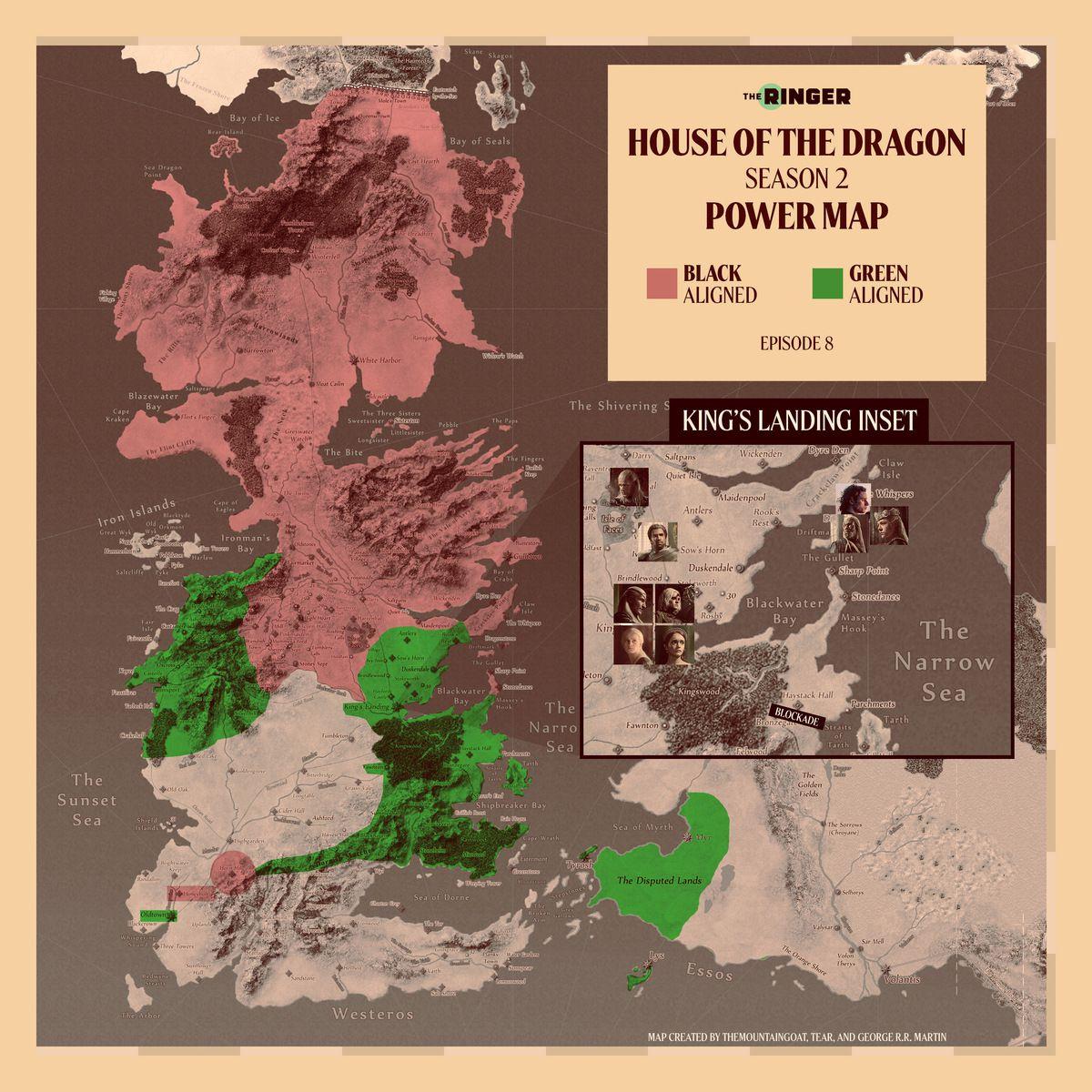 The Triarchy is on the board thanks to Tyland’s prowess in the mud-fighting pit. That’s the biggest change to the map in a while, and it gives the greens the naval power to match the blacks. Though Aemond and Co. still have a major dragon deficit (and are facing a reunified Daemon and Rhaenyra), the greens made up some significant ground. Here’s how it all looks: