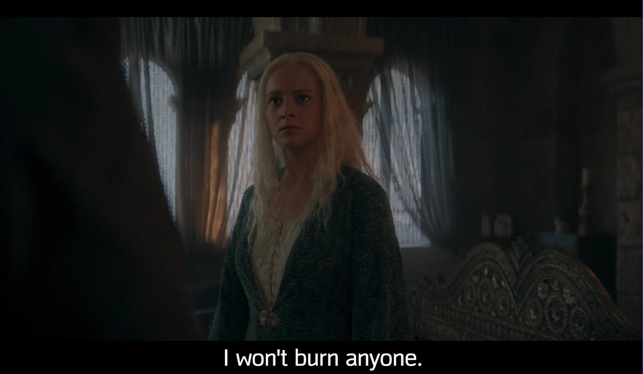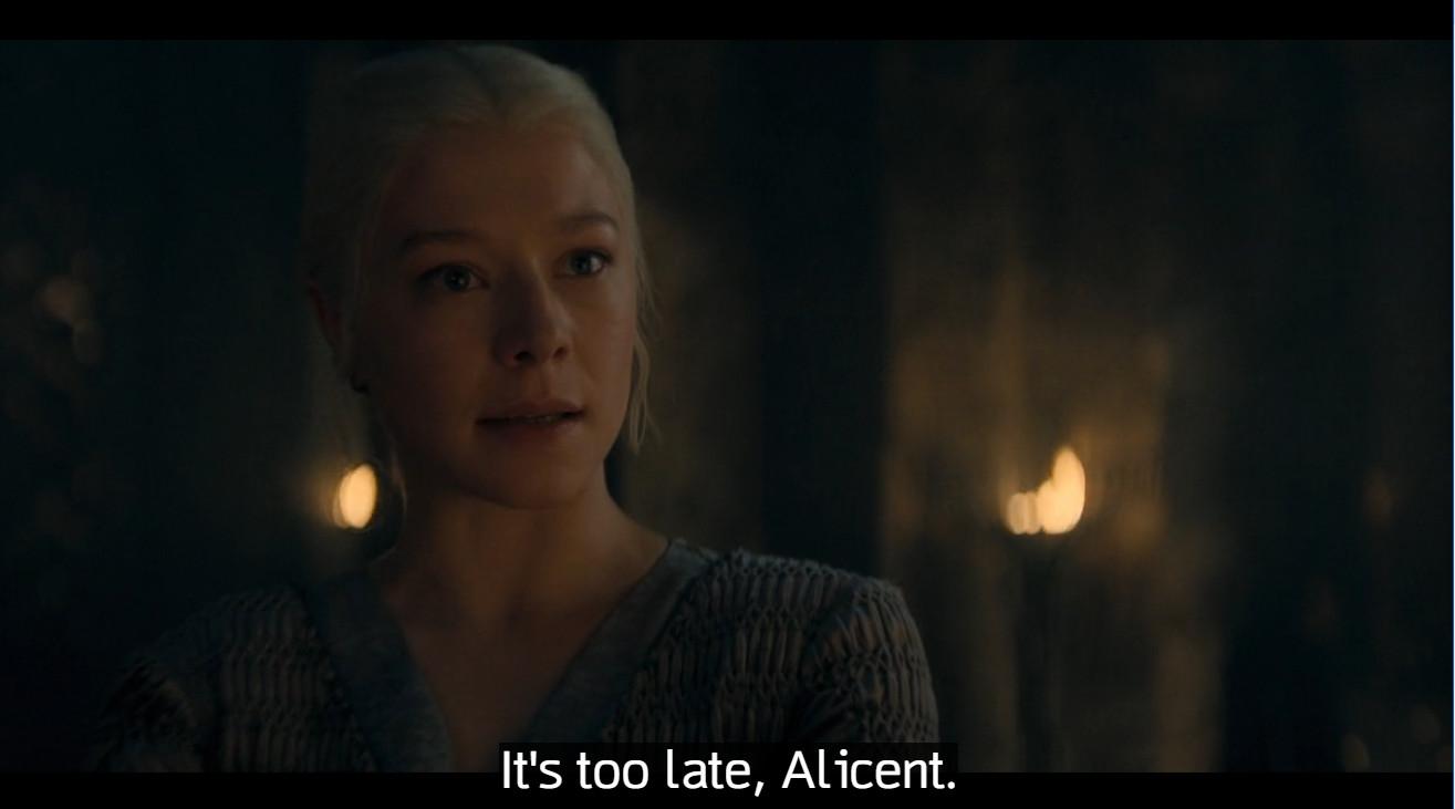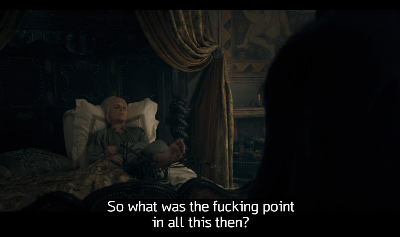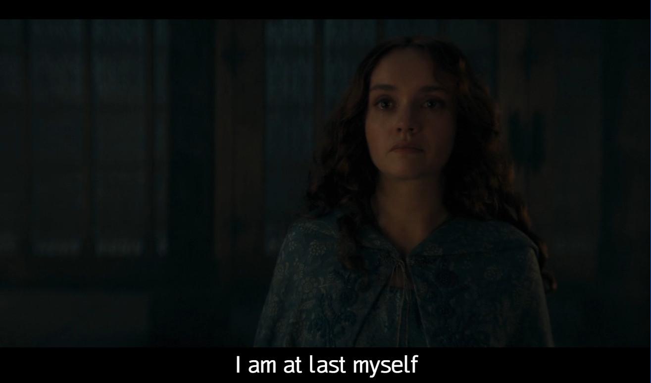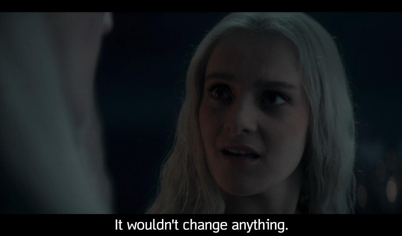 And yes, I saw the final imagery of Alicent out in the big open sky and Rhaenyra trapped among her scrolls; I read the interviews that said Alicent is finally free. But sister still has a lot to do in the next couple of days. Chop, chop you future kingslayer, you!