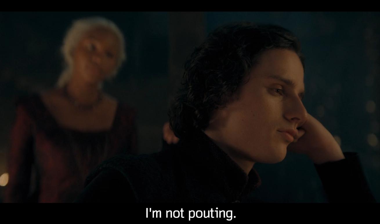 But probably not if Aemond has anything to say about it! Aemond is doing everything in his power not to admit defeat. His next two days will be spent blaming everyone else for his inadequacies as a leader, listening to no one, and working himself into a tizzy of anger and insecurity that will cost the lives of thousands. He will ride into battle, sparing no life, no ally, no family member. He will make dust beneath Vhagar’s feet, and he will learn nothing. But mostly, of course, he will be thinking about how his magic sister said he’ll die.