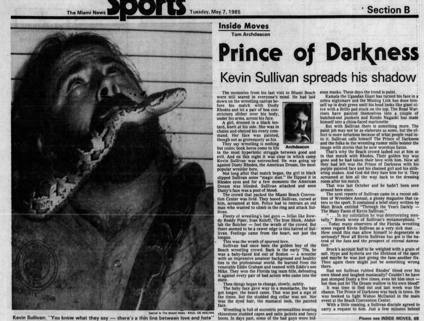 This level of creativity and willingness to push boundaries made Sullivan must-see TV, even for his fellow wrestlers, including Syracuse University amateur wrestling star Mike Rotunda, who would later work extensively with Sullivan and whose sons, Taylor (Uncle Howdy) and Windham (the late Bray Wyatt), certainly borrowed from Sullivan’s supernatural playbook, recalled to The Ringer, “I was down in Florida as a babyface when Kevin was starting his demonic stuff, and I thought that devil gimmick was pretty crazy. I mean, it was different for sure, and it made things a lot of fun when I got to work some matches with Kevin.”