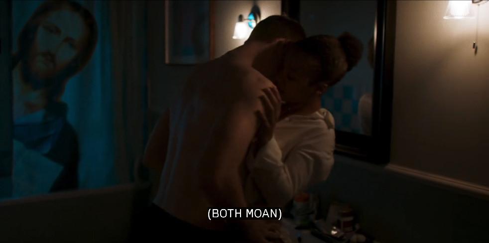There’s a fair amount of ground to cover on this one, and I don’t just mean the bathroom floor. Poor Rob is just trying to brush his damn teeth when Harper comes home all gakked up from her bat/nightdress hangout with Rishi. She starts making out with Rob, but her friend-roommate-colleague isn’t quite rising to her level, and so Harper does what Harper does best: she takes matters into her own hands, laying down for a frenzied solo sesh right there on the bathmat under the gentle, watchful gaze of Shower Curtain Jesus.