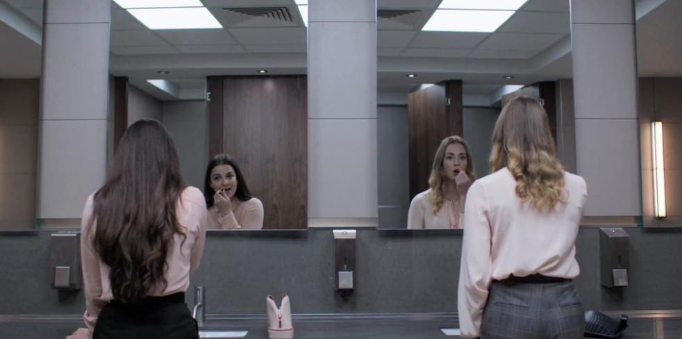 It’s stressful as hell when you encounter a superior coming out of the bathroom stall. Eye contact in the mirror and smile, or focus reallyreally hard on drying your hands? Small talk, or respectful silence? Fresh Pierpoint hire Harper stays quiet—and chooses poorly. “You’ve been here three weeks,” snaps middle manager Daria, “and you’ve barely said a word to me.”