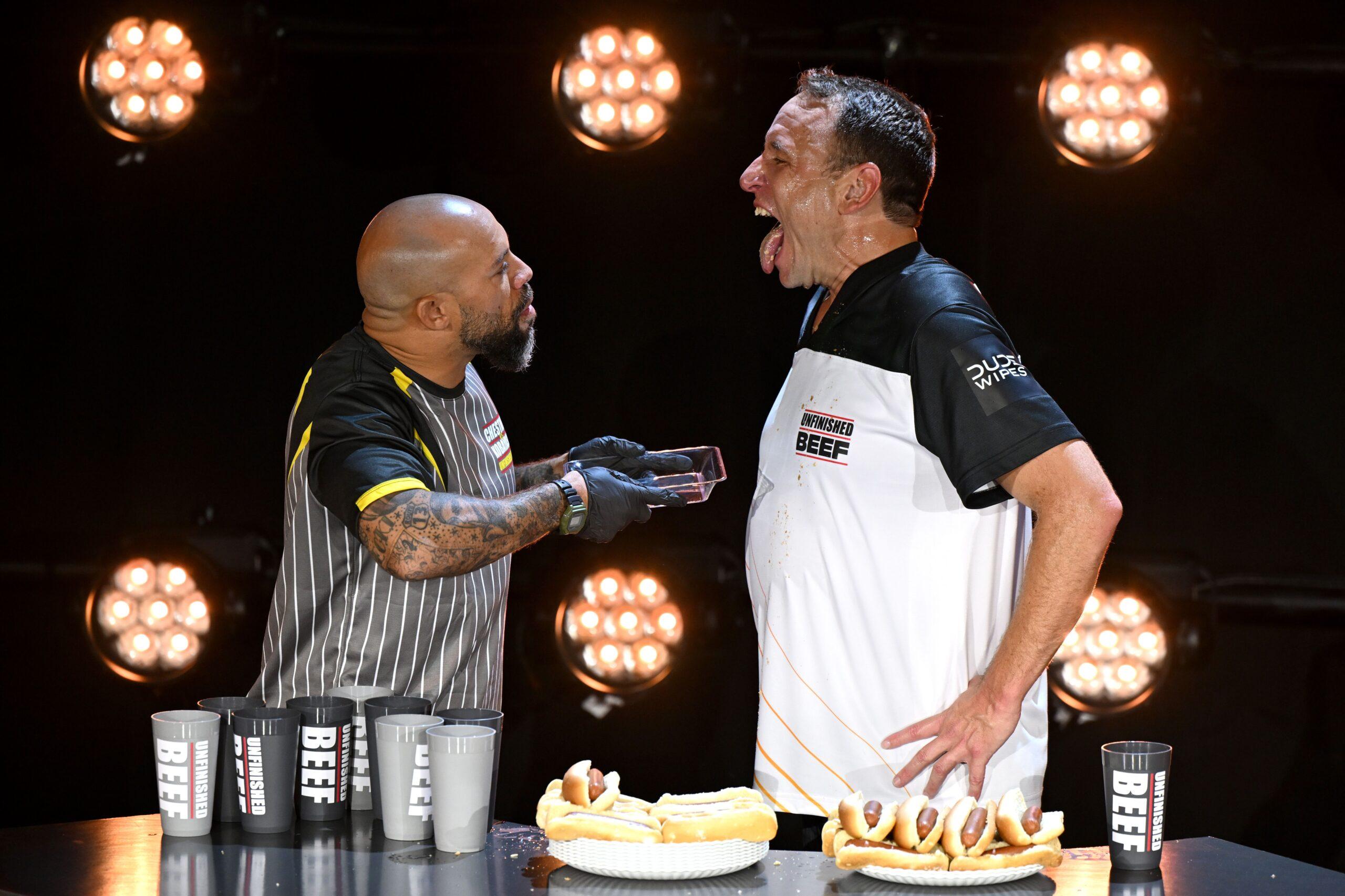 Joey Chestnut takes the victory in the ‘Unfinished Beef’ hot-dog-eating contest vs. Takeru Kobayashi.