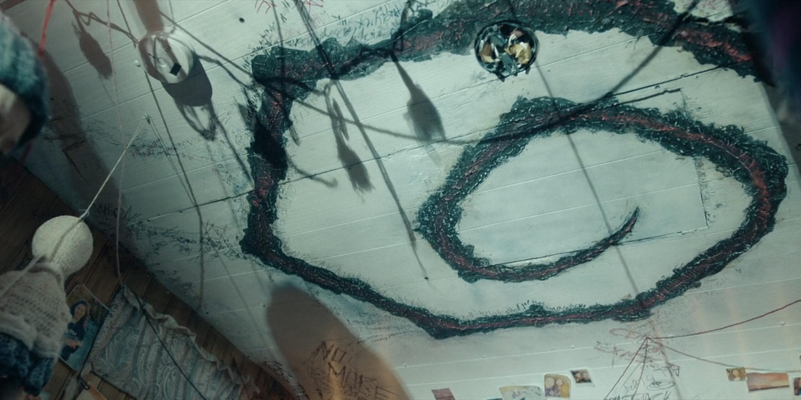 In Season 1, the Yellow King appears in the form of Childress, while Carcosa is the name of Childress’s spooky home base. But this haunting, supernatural imagery, as well as that of the wider cult, taps into something much more sinister that seems to go beyond anything as rationally explicable as a single serial killer or his disturbing hangout spots. Throughout the season, Cohle experiences sporadic visions that he explains away as mental health issues exacerbated by his years of heavy drug use while working undercover. But these visions often arrive in moments that hold deeper meaning. (Notably, in Night Country, Rose advises Navarro, “Don’t confuse the spirit world with mental health issues.”) In the season finale, Cohle sees some sort of vortex—that sure looks like a giant spiral—appear above him in Carcosa just before he fights Childress: