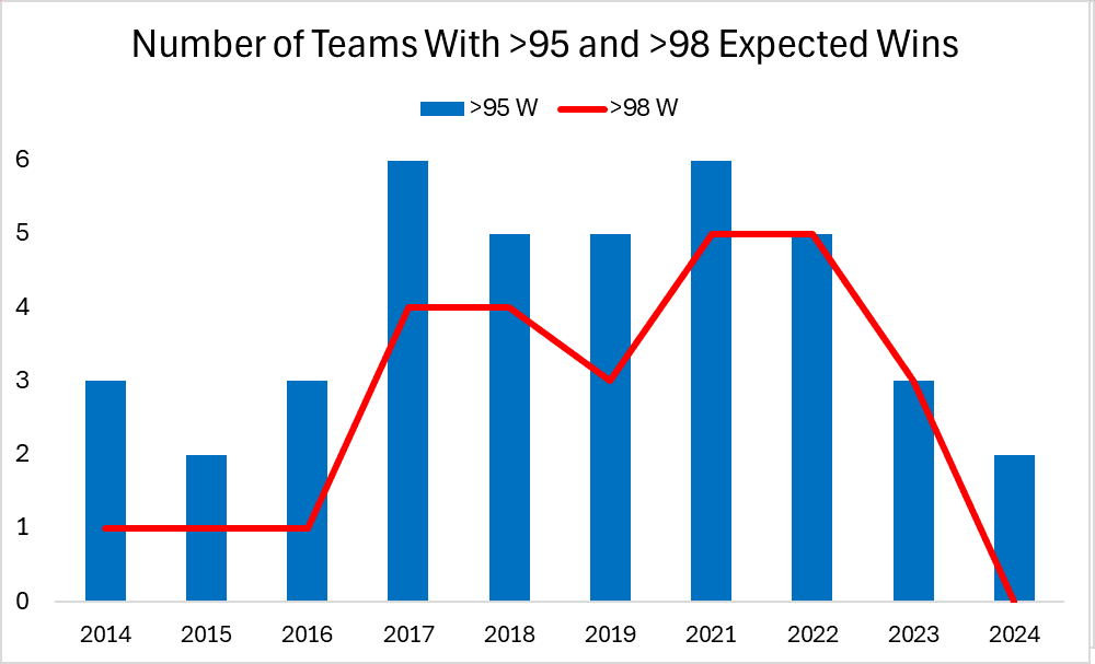 The absence of superteams this season is striking in relation to the past decade. The Dodgers led the majors in 2024 with 98 wins, marking the first time since 2014 that no one won 100 or more. The Dodgers were the only team to top 95 wins, and for the first full season in half a century (since 1974), no American League team even reached that mark. The graph below, which excludes COVID-shortened 2020, shows the number of teams to top 95 and 98 wins, respectively, in each of the past 10 seasons, making clear that this year is a dramatic deviation from recent norms.