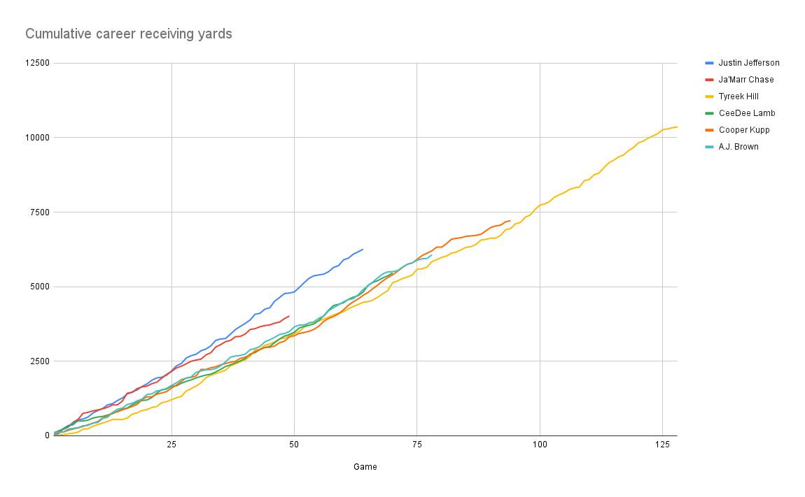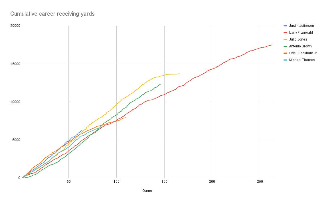 To get a sense of what Jefferson’s career numbers look like against the best players in history, here’s a chart showing the cumulative receiving yards of some Hall of Famers, plus Jefferson: