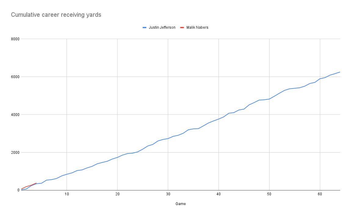 Obviously Jefferson has a long way to go. The sheer length of Jerry Rice’s line on this chart is mind boggling—but at least through four-plus seasons, Jefferson is on-pace to smash all these guys.