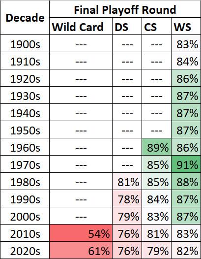 Sure enough, the division series, championship series, and World Series rates for the 2010s and 2020s are lower than those of earlier decades. In the 1970s, the high-water mark for this formulation of roster consistency, players who appeared in the postseason had amassed 91 percent of their teams’ regular-season playing time; only 9 percent of regular-season reps went to players who were absent in October. In the first four World Series of the 2020s, postseason players accounted for only 82 percent of regular-season opportunities, meaning that twice as much regular-season playing time went to non-postseason players as in the 1970s. The changes aren’t enormous, but they’re there.
