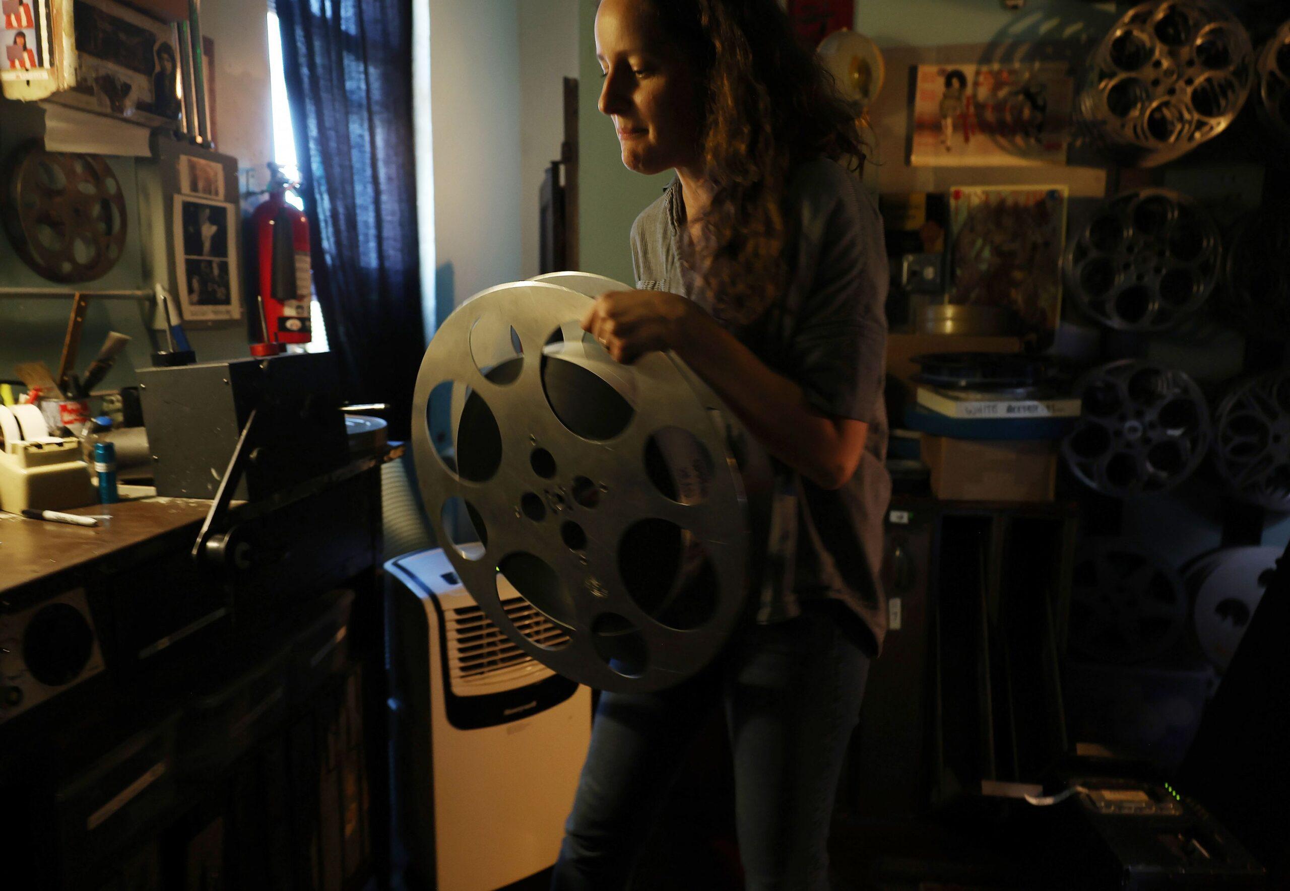 Music Box Theatre assistant technical director Rebecca Lyon carries a reel of the film Oppenheimer.