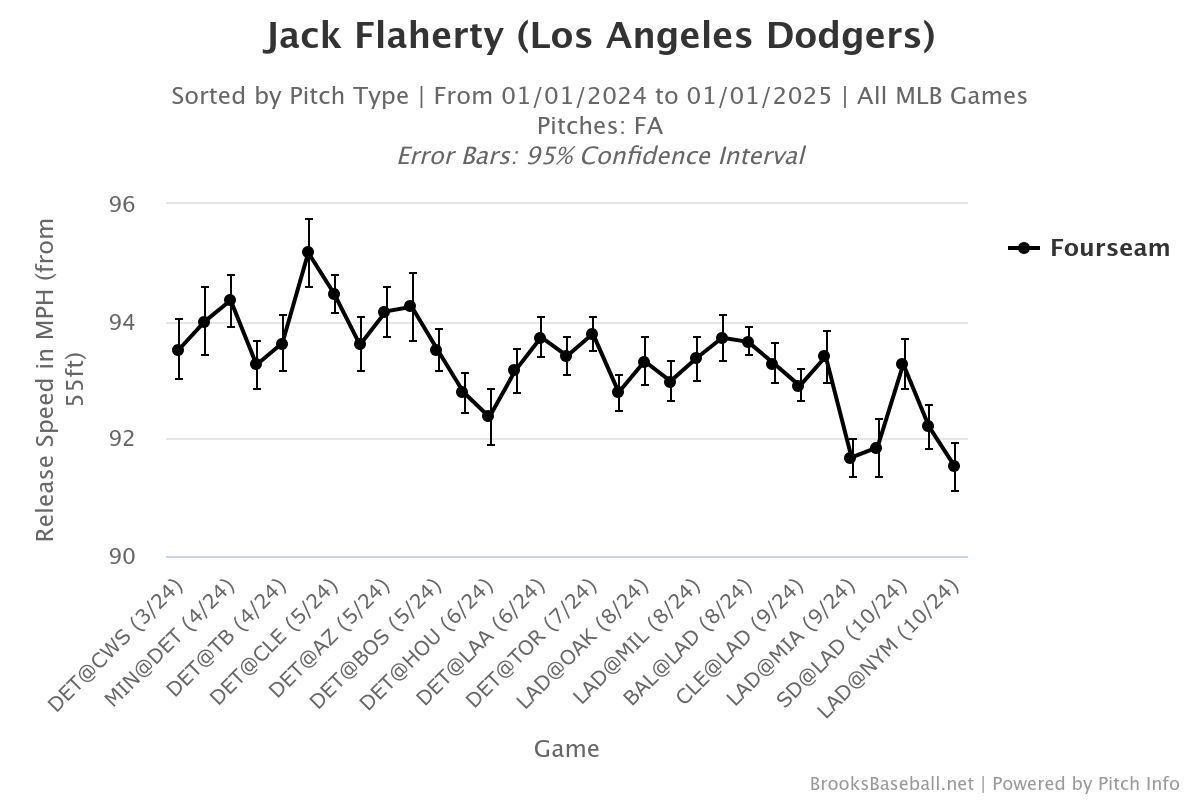 The Dodgers are down to three starters, and each of them comes with a cause for concern. Flaherty, who’s starting Game 1, saw his pitch speeds sink in September, and his strikeout and walk rates soon headed in similarly disconcerting directions. The righty’s one strong start this postseason, in NLCS Game 1, was sandwiched between a couple of clunkers. This week, Dodgers pitching coach Mark Prior said Flaherty’s problems aren’t injury related, but Prior still described himself as “moderately concerned.”