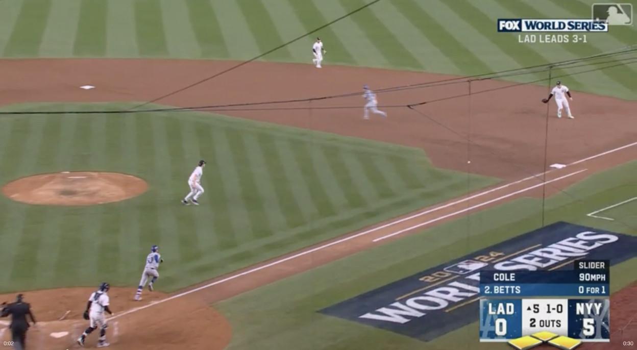 With the Dodgers in danger of stranding all three runners they’d placed on base with no outs, another MVP fails to muster hard contact against Cole. Mookie Betts rolls a slow, spinning grounder toward Rizzo, who squares in front of the ball as Cole maneuvers toward first, about to escape the stressful inning unscathed. This appears to be as routine a play as exists in an MLB infield.