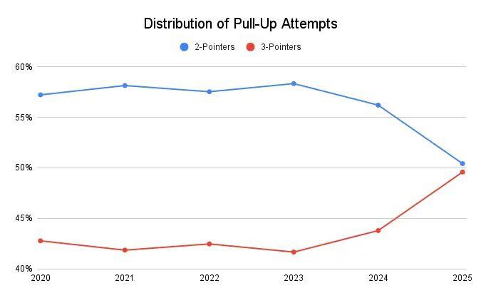 Perhaps most striking is the split between pull-up 2s and pull-up 3s. Over the past half decade, 42.5 percent of pull-up attempts were 3s, with little year-to-year variation, according to an analysis of NBA Advanced Stats data. But so far this season, 49.6 percent of pull-ups are coming from beyond the arc.