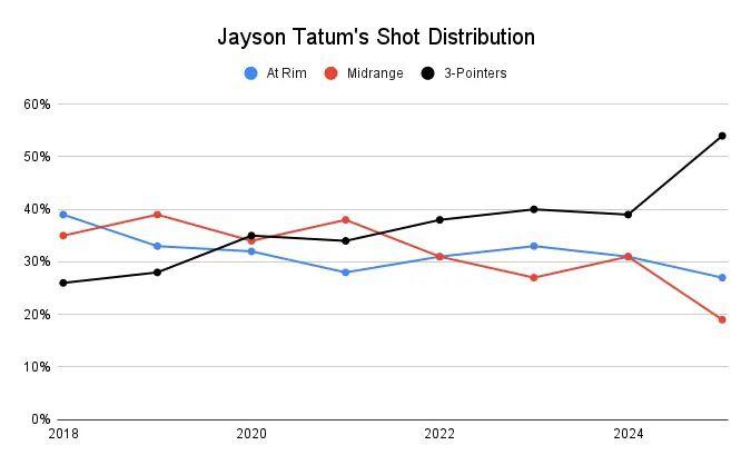 Look at Tatum’s distribution for a particularly potent example. In the past, per CtG, he split his shots roughly evenly: one-third at the rim, one-third from the midrange, and one-third from beyond the arc. But this season, his midrange rate has plummeted to 19 percent, while 54 percent of his attempts are 3s.