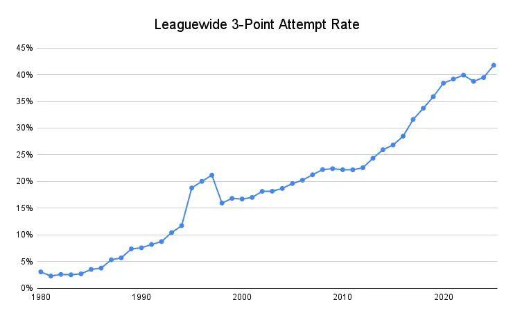 However, the early growth in 2024-25 looks like last decade’s. Look at the skyward turn at the far right of that graph—rather than level off, the NBA’s 3-point revolution has leveled up again, to 42 percent of all shot attempts.
