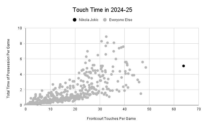 And Jokic has boosted his points and assists because he’s handling the ball more than ever before. Jokic led the NBA in touches in the frontcourt in each of the past six seasons, according to tracking data, but by only a small margin each year. This season, however, the gap between Jokic and second-place Jayson Tatum is larger than the gap between Tatum and 41st place. Look at how lonely Jokic’s dot is on this chart.
