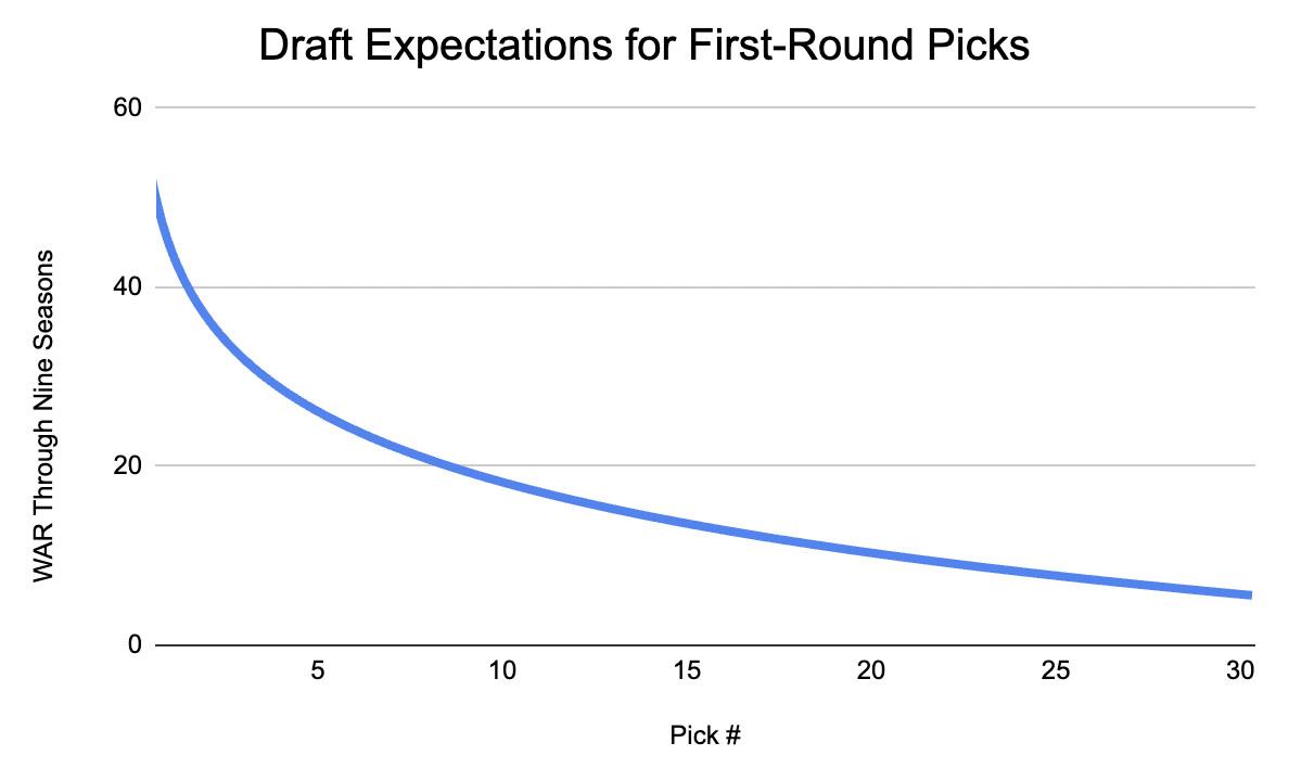 To do so, we analyzed the draft classes from 2000 to 2016 and, using wins above replacement (based on Basketball Reference’s value over replacement player metric), calculated each first-round pick’s value through his first nine NBA seasons (to account for the entirety of a rookie contract and possible max extension). Those results give us a nice curve that shows the expected value for each draft slot (and it happens to look very similar to Kevin Pelton’s draft value chart at ESPN).