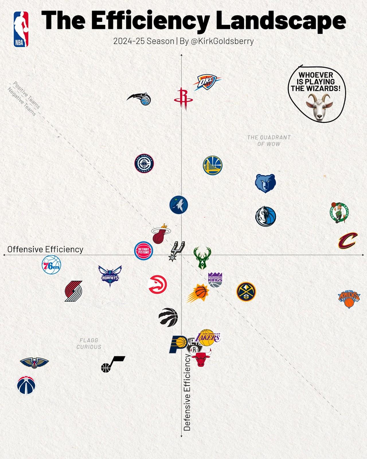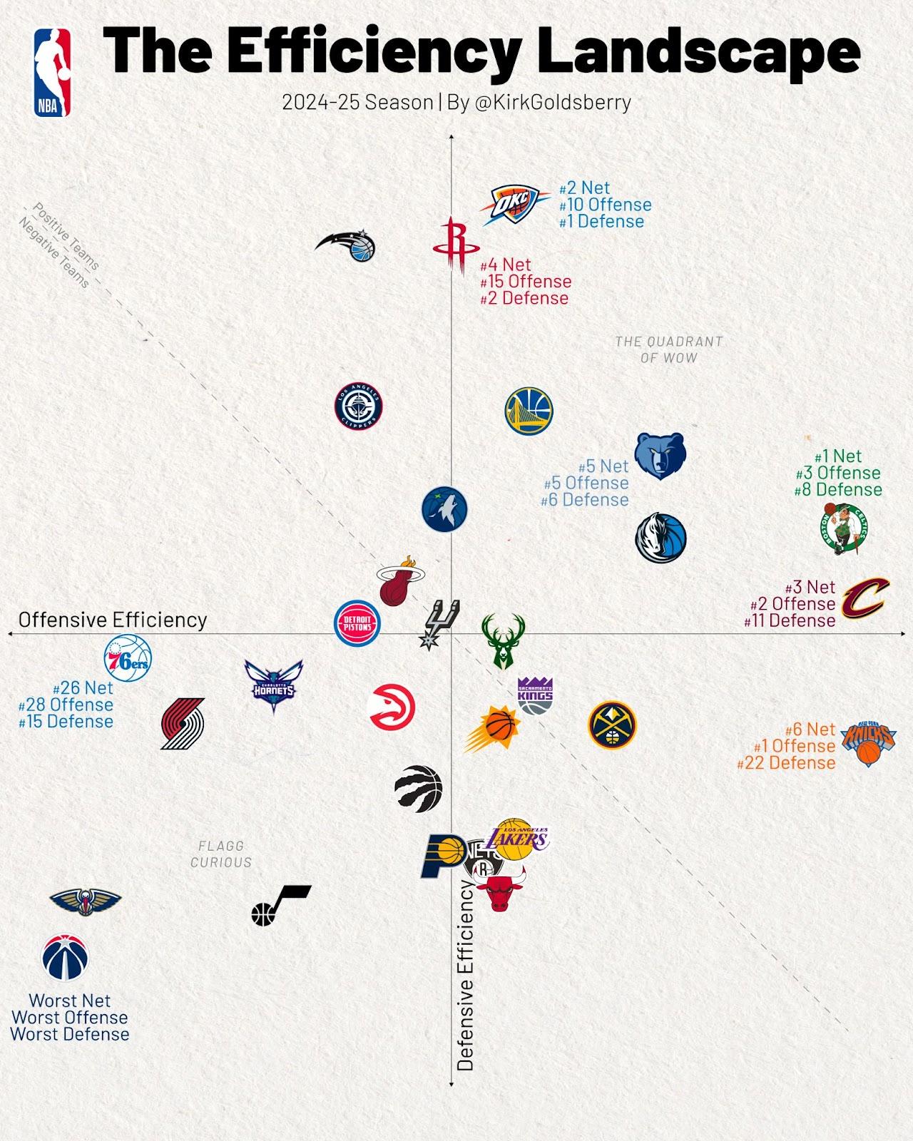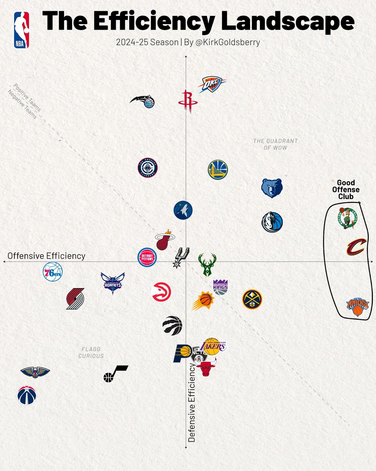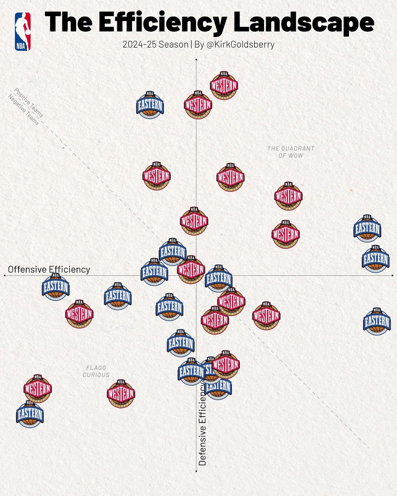 Welcome to the 2024-25 Efficiency Landscape, a visual summary of trends around the NBA. All 30 teams are placed according to their offensive (x-axis) and defensive (y-axis) ratings. Bad offenses own the left side of the graphic, and good offenses appear on the right. Strong defenses appear near the top and bad ones at the bottom.
