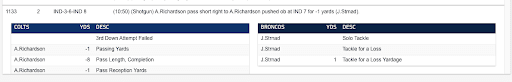 The Colts were backed up deep in their own territory in the second quarter, and Richardson, foolishly, you might argue, attempted a pass from inside his own end zone. The ball hit a Denver defensive lineman right in the hands and ricocheted immediately back to Richardson, who tucked it into his arms and started running. He made it just 3 yards out of the end zone when he was tackled a yard behind the line of scrimmage.