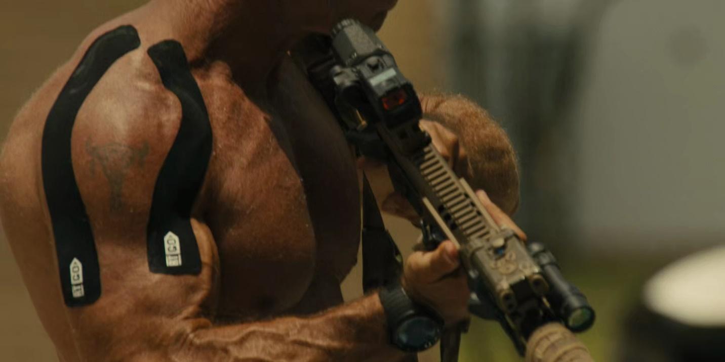 Viewers have seen much more of him than we’re used to, and I mean that in more than one way. Sheridan made his Lioness acting debut in the Season 2 premiere, as his character accompanied protagonist Joe (Zoe Saldaña) and her quick-response force on a dangerous mission into Mexico. When we meet Mr. Spears, the vascular, striated Sheridan is stripping down and gearing up alongside Saldaña, an activity that gives him the chance to show off his guns and his guns. It’s a scene that seems calculated to highlight how big a beefcake he is, via half-frontal shots of him flexing from the waist up.