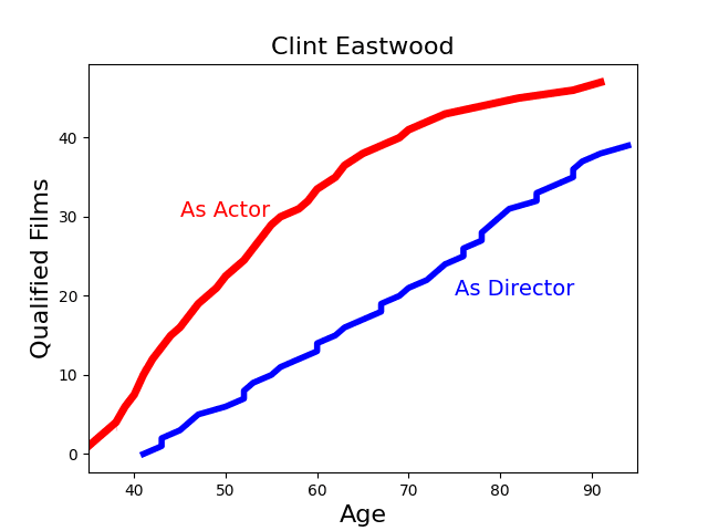 Going by this metric, Clint clears. Not only does he have the most qualifying credits, but he also has a nearly even split between acting and directing. Among the members of this list, only Woody Allen has more directing credits than Eastwood, and Allen doesn’t have nearly as many acting credits. Conversely, only Jackie Chan and (barely) Sylvester Stallone have more acting credits, and neither of them has nearly as many directing credits. (If you’re wondering where some other prominent actor-directors are—Cassavetes, John Huston, Mel Brooks, Sydney Pollack, Laurence Olivier—they didn’t quite clear the bar for top-billed qualifying movie roles or have enough total credits or popularity to join this upper echelon.)