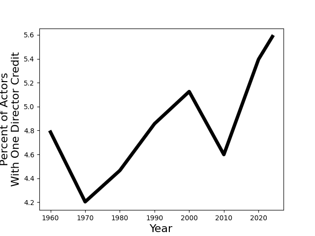 (Clearly, directing has historically been skewed heavily toward men—and that gender bias remains strong. Angelina Jolie and Jodie Foster, who have four qualifying directing credits apiece, are the only woman to make the top 30 on the acting-directing leaderboard, without much room to spare; Mélanie Laurent, Elizabeth Banks, and Julie Delpy appear on the top 40, with four directing credits each but fewer acting credits than Jolie and Foster.)