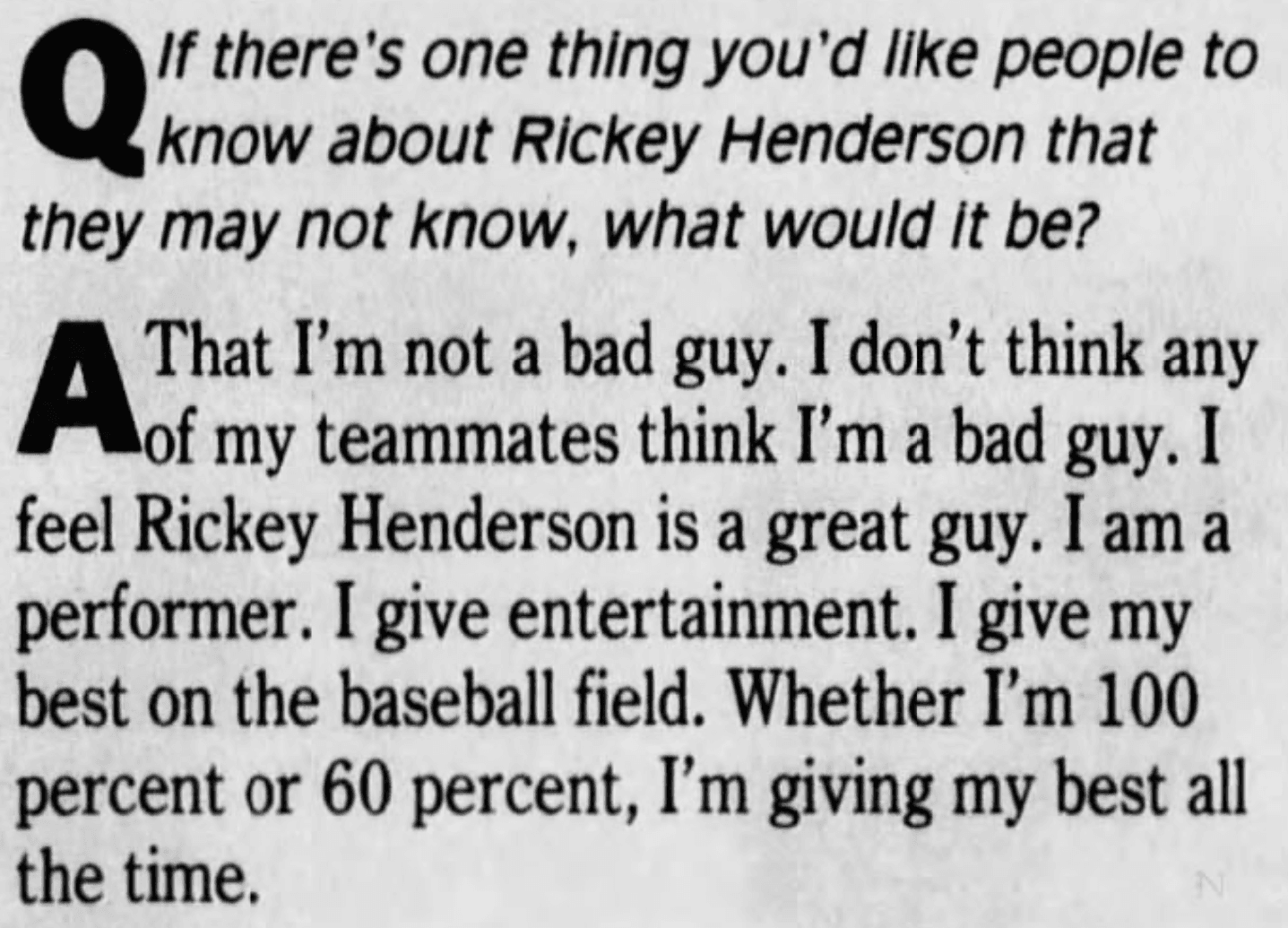 “I wish the game would be just left alone,” Henderson said in response to the new rules. “But if they’re going to [make these changes] they got to add 50 or 60 on mine. That’s the new rule.” No one was sure whether he meant 50 or 60 steals total or per season, but knowing Rickey, it was likely the latter.