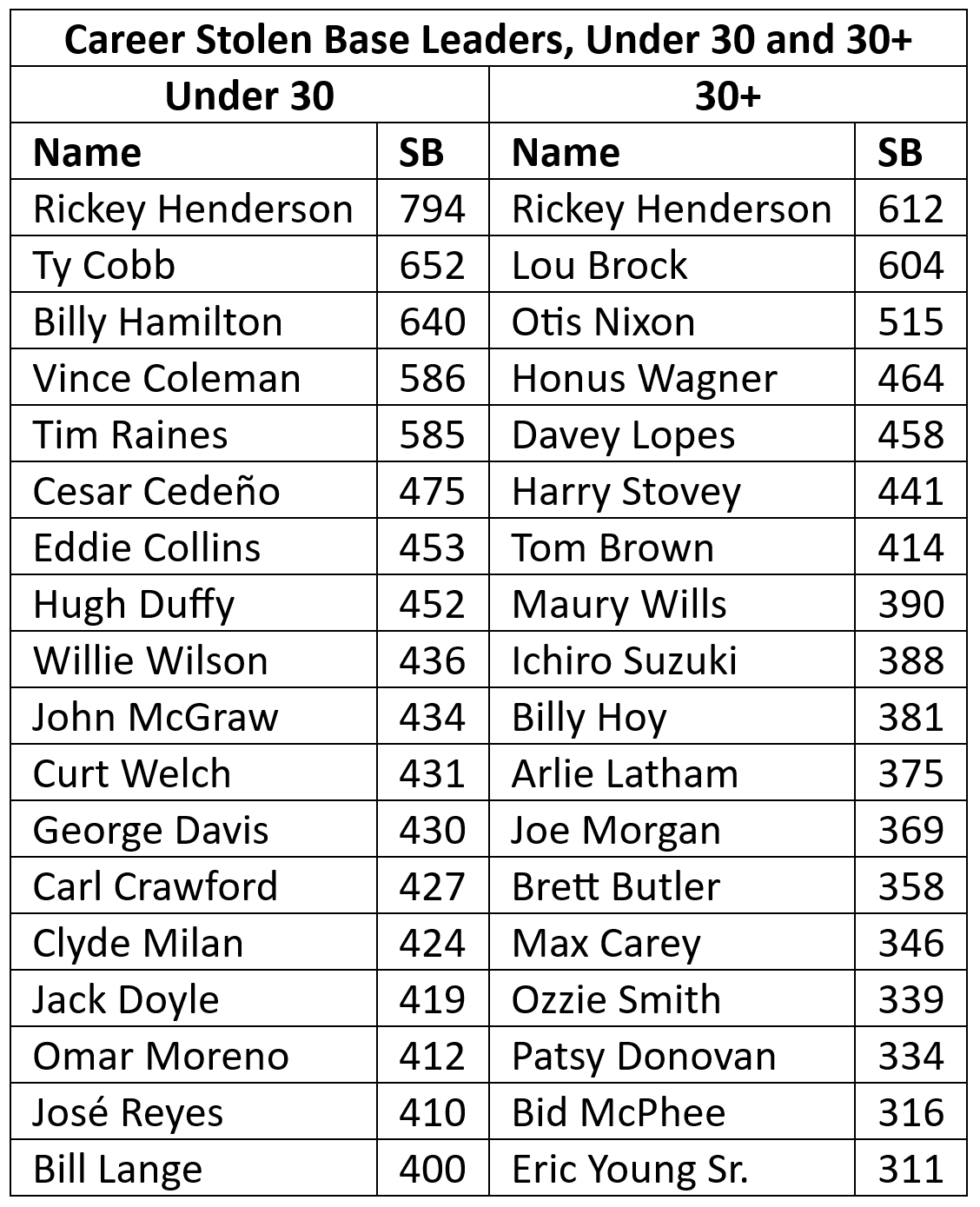 That’s not the most impressive stat about Henderson’s steals. Try this table on for size: The players on the left are the all-time stolen-base leaders through age 29; the players on the right are the all-time leaders from age 30 on.