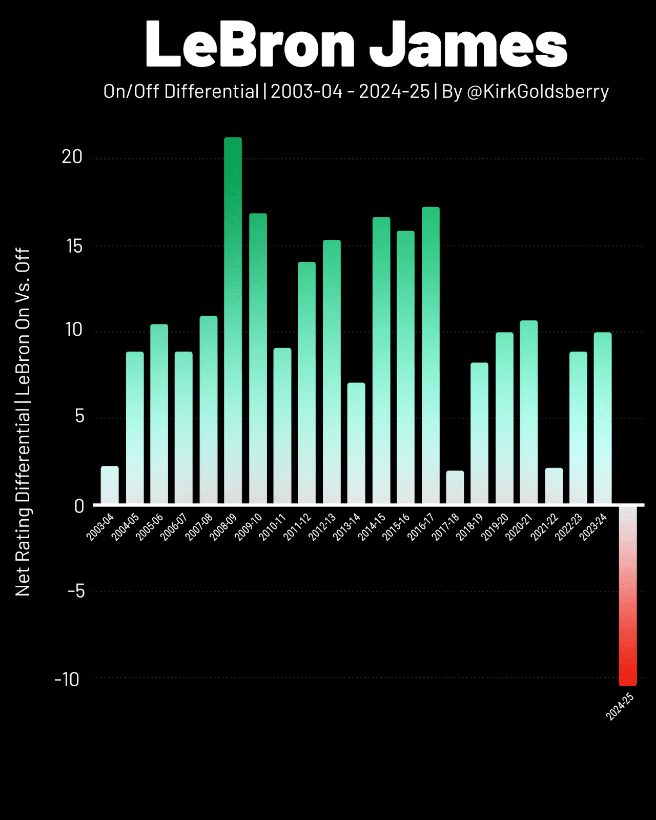 The chart below shows the on/off differentials of every James team dating back to his rookie season. As you can see, for 21 straight campaigns, his teams benefited from having him on the floor. Year 22 is a vastly different story.