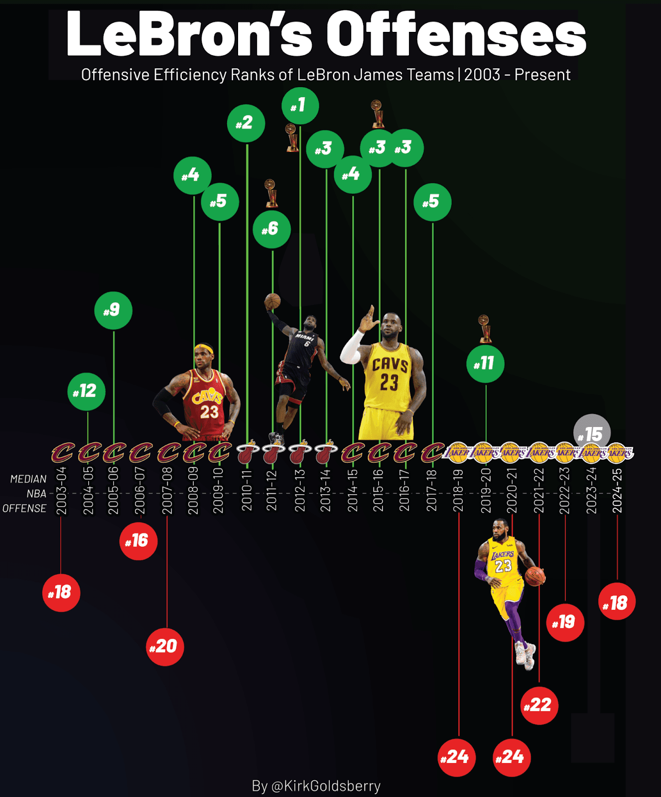 - In his last 10 seasons in the Eastern Conference, James’s teams rated in the top six in offensive efficiency every single year.