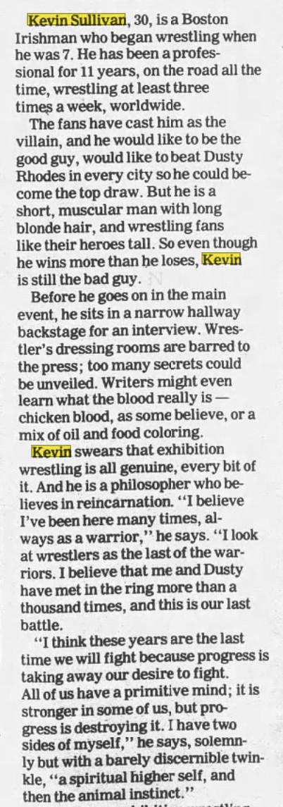 In an interview for Douglass’s book Bahamian Rhapsody, Pride recalled the intensity of Sullivan’s character work: “When Kevin had an interview and you saw it on television, you had to come see Tyree beat the hell out of Kevin Sullivan. He had more gimmicks than anyone else I’d ever seen.”