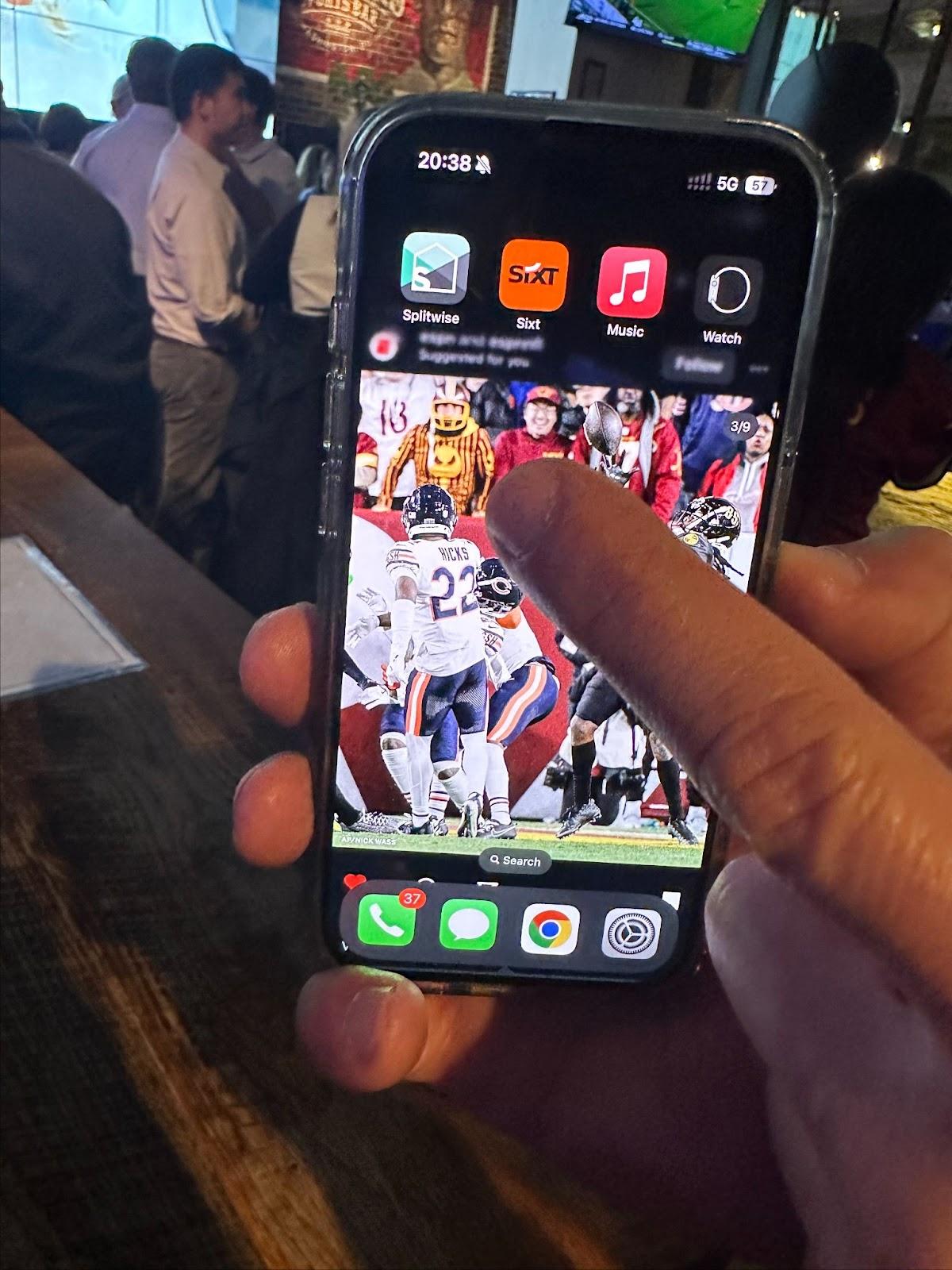 Back at Walter’s, after celebrating a Washington touchdown in that Week 11 game, Dimitri showed me his phone. His background was a photo of the Hail Mary from Week 8—and there, sitting in the front row just behind the play, was Dimitri, wearing a helmet and screaming. His father had passed away a few weeks earlier, and Dimitri almost didn’t go to the game. But the day before, he scooped up a single ticket—his first time in the front row.