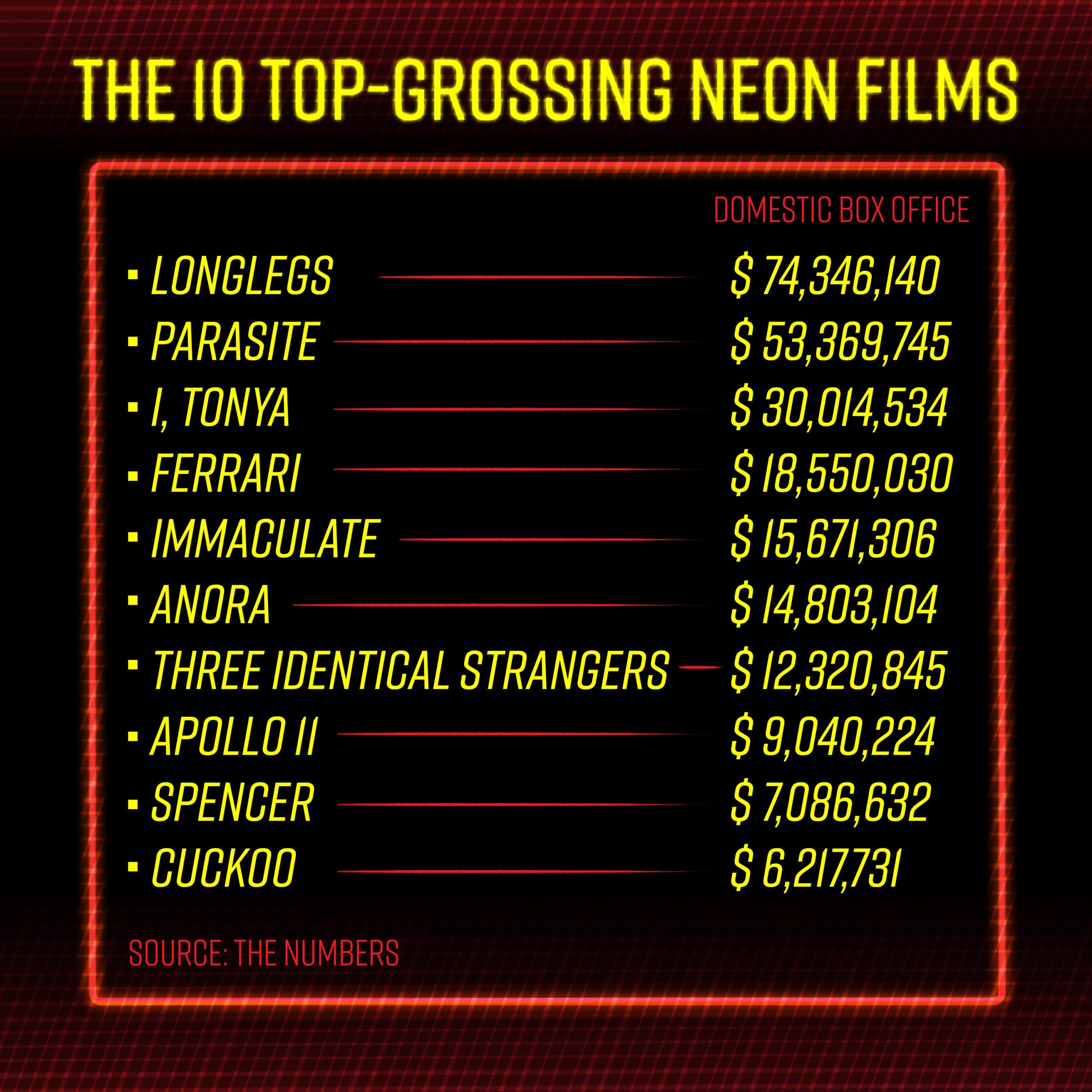 Parasite was previously Neon’s top-grossing film in the U.S., the winner of the Best Picture Academy Award, and the winner of the Best International Feature Film. Perhaps more notable is that in 2024, Neon released three different films that have or could find themselves in each of those three categories: Longlegs, Anora, and The Seed of the Sacred Fig, respectively.