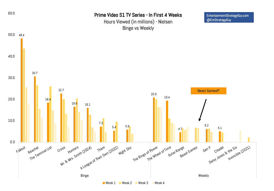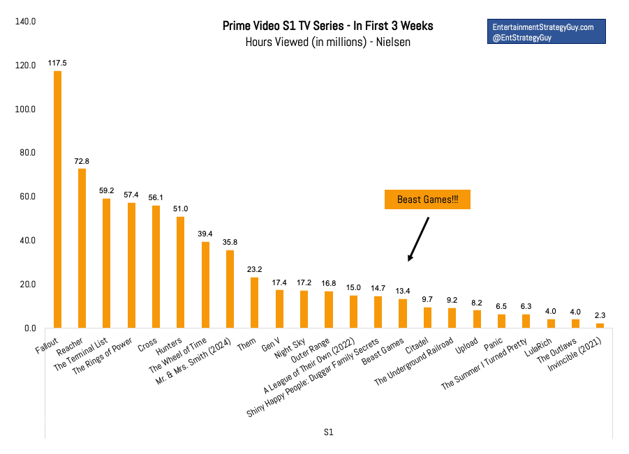 Amazon trumpeted that Beast Games attracted 50 million “viewers” (which the company doesn’t define) in its first 25 days. But Prime Video’s heavy hitters have easily surpassed that pace. Red One reached that total in three days; Season 1 of The Lord of the Rings: The Rings of Power reached 25 million viewers in its first day, and 100 million in three months; Season 2 of Rings of Power reached 40 million viewers in 11 days; and Fallout reached 65 million viewers in 16 days. Two charts published by the Entertainment Strategy Guy make clear that Beast Games didn’t get off to an especially strong start by Prime Video standards, even compared to previous weekly releases. It’s been about as popular as Outer Range (which was canceled after two seasons), and a lot less popular than The Wheel of Time.