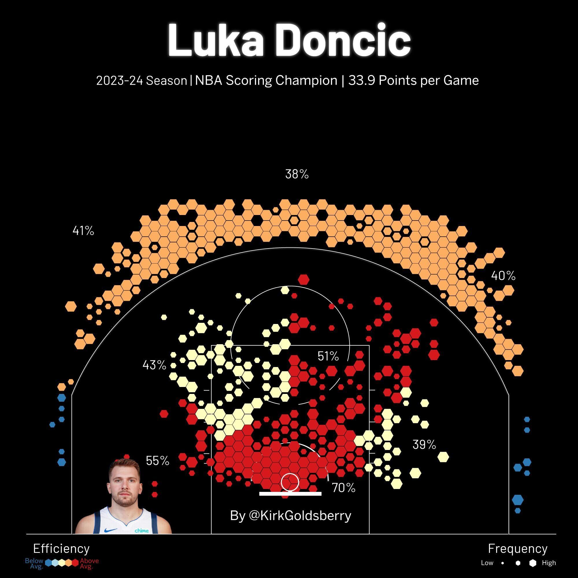 If there’s one major development that fueled Doncic’s rise to scoring champ, it’s the improvements in his long-range shooting. Last season, he set career highs in both 3-point attempts and 3-point percentage, converting 38.2 percent of 744 total 3s.