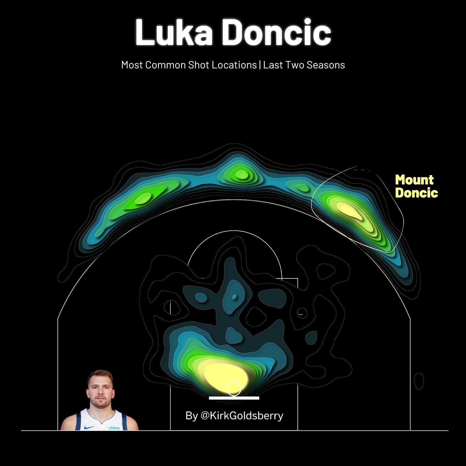When you map out Doncic’s most common shot locations, there are two hot spots: one near the rim and another deep along the left wing. This perimeter hot spot is where he got Braun on Saturday night—it’s also the epicenter for Doncic’s favorite dance.