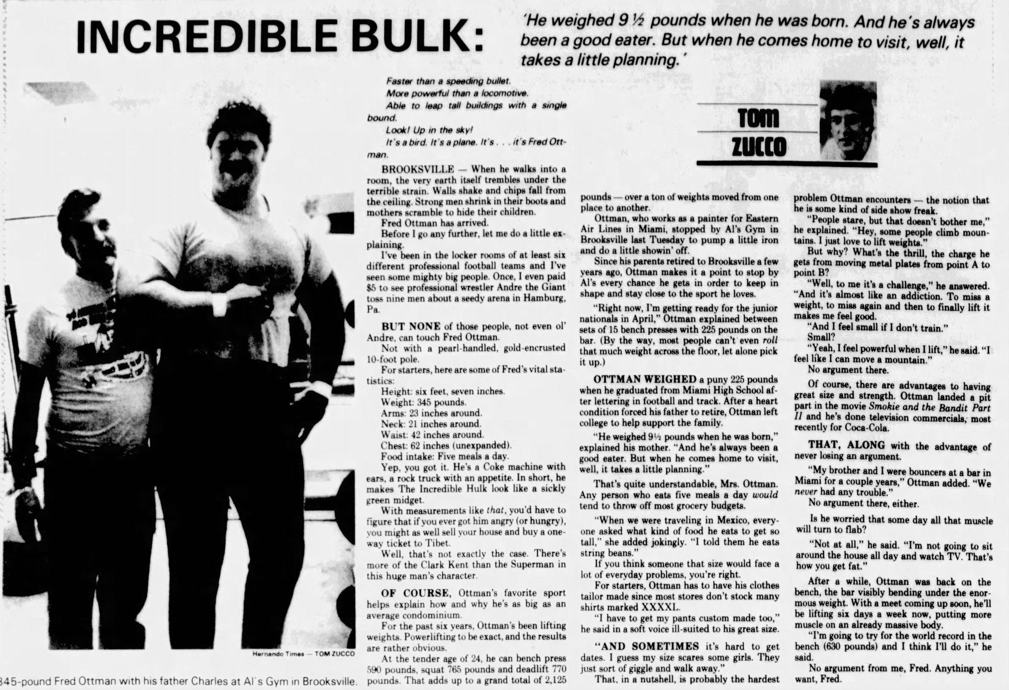 Meanwhile, Fred Ottman took a more traditional path to pro wrestling stardom. Born in 1956, the Miami native became an accomplished powerlifter before entering the business. A 1981 Florida newspaper article detailed his incredible physical specifications—23-inch arms, a chest exceeding 60 inches, and the ability to bench-press 590 pounds, squat 765, and deadlift 770. Standing 6-foot-3, his newsworthy size and strength made him an imposing figure—so much so, he told the reporter, "my size scares some girls," though not his first wife, Bobbi Rodriguez, the sister of Dusty Rhodes’s wife, Michelle Rubio, and aunt to Cody.